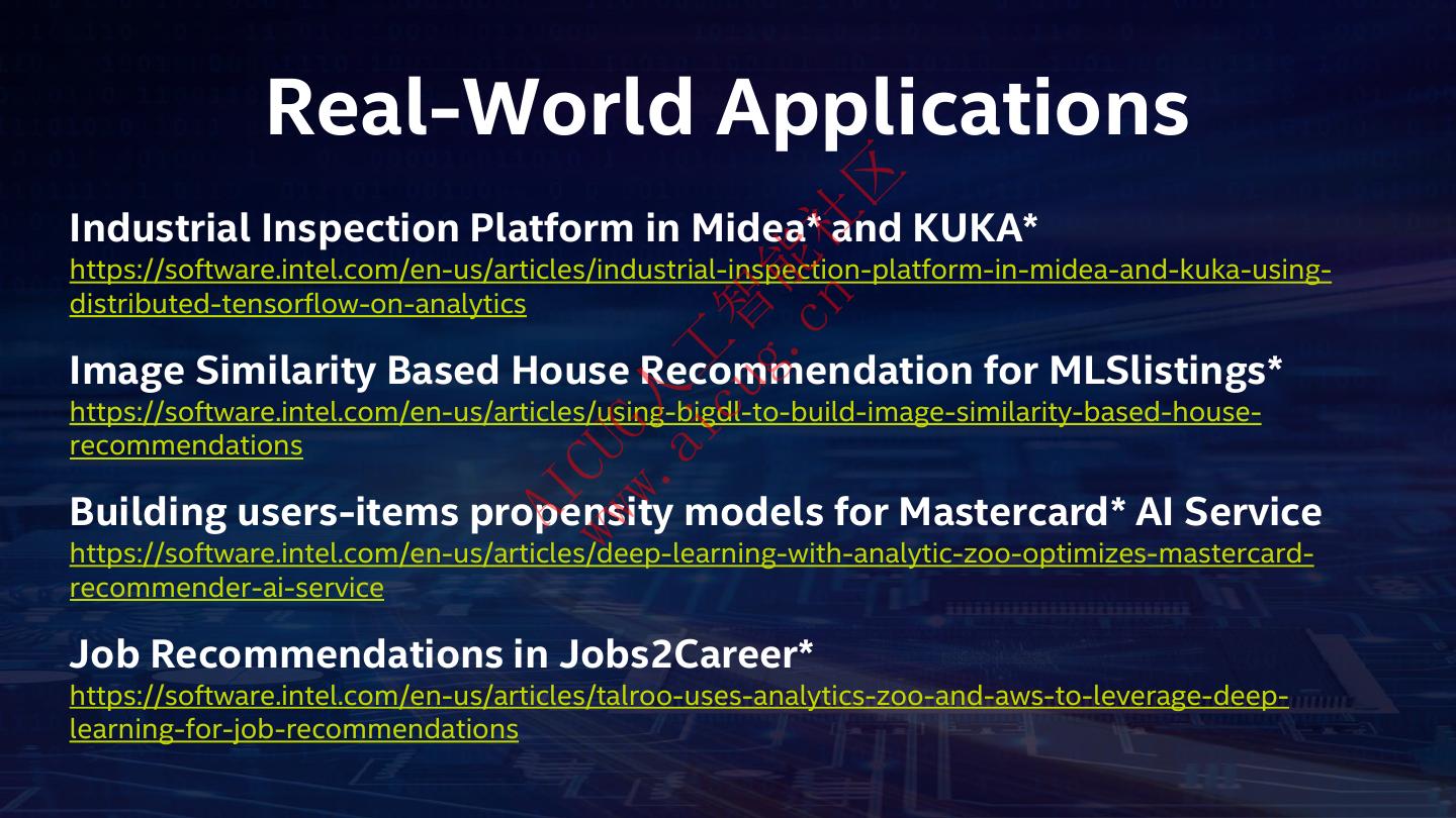 27 . Real-World Applications 区 Industrial Inspection Platform in Midea* and KUKA* cn 社 https://software.intel.com/en-us/articles/industrial-inspection-platform-in-midea-and-kuka-using- g. 能 distributed-tensorflow-on-analytics cu 智 ai 工 Image Similarity Based House Recommendation for MLSlistings* w. G人 https://software.intel.com/en-us/articles/using-bigdl-to-build-image-similarity-based-house- recommendations ww CU Building users-items propensity models for Mastercard* AI Service AI https://software.intel.com/en-us/articles/deep-learning-with-analytic-zoo-optimizes-mastercard- recommender-ai-service Job Recommendations in Jobs2Career* https://software.intel.com/en-us/articles/talroo-uses-analytics-zoo-and-aws-to-leverage-deep- learning-for-job-recommendations