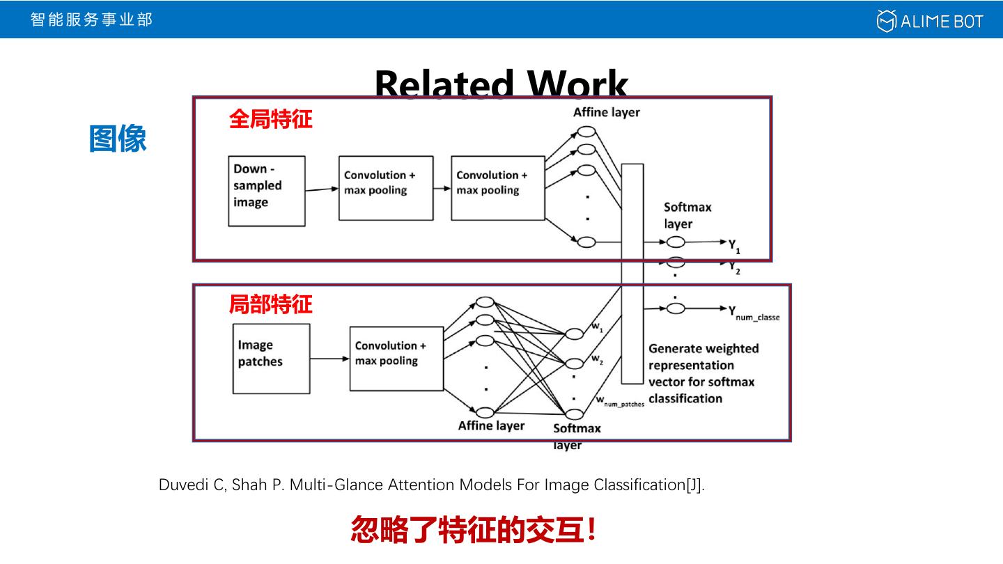 9 .智能服务事业部 Related Work 全局特征 图像 局部特征 Duvedi C, Shah P. Multi-Glance Attention Models For Image Classification[J]. 忽略了特征的交互!