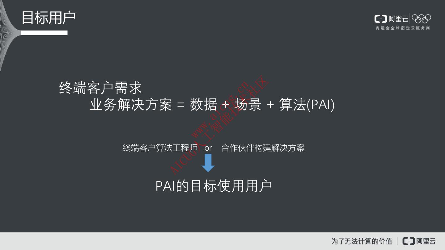 3 .目标用户 区 终端客户需求 术 cn 社 技 g. 业务解决方案 = 数据 + 场景 + 算法(PAI) 能 cu 智 ai 工 . ww G人 w 终端客户算法工程师 or 合作伙伴构建解决方案 CU AI PAI的目标使用用户