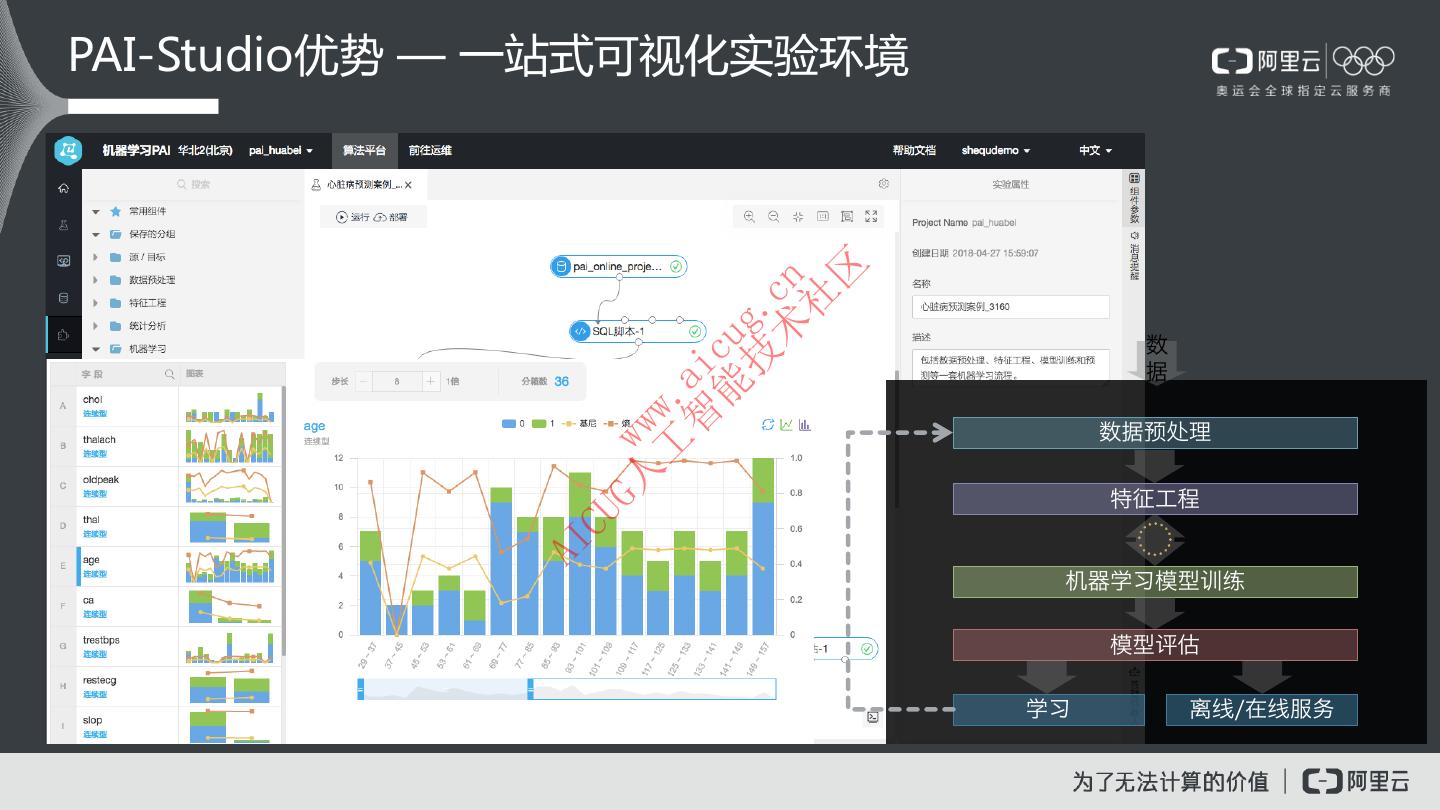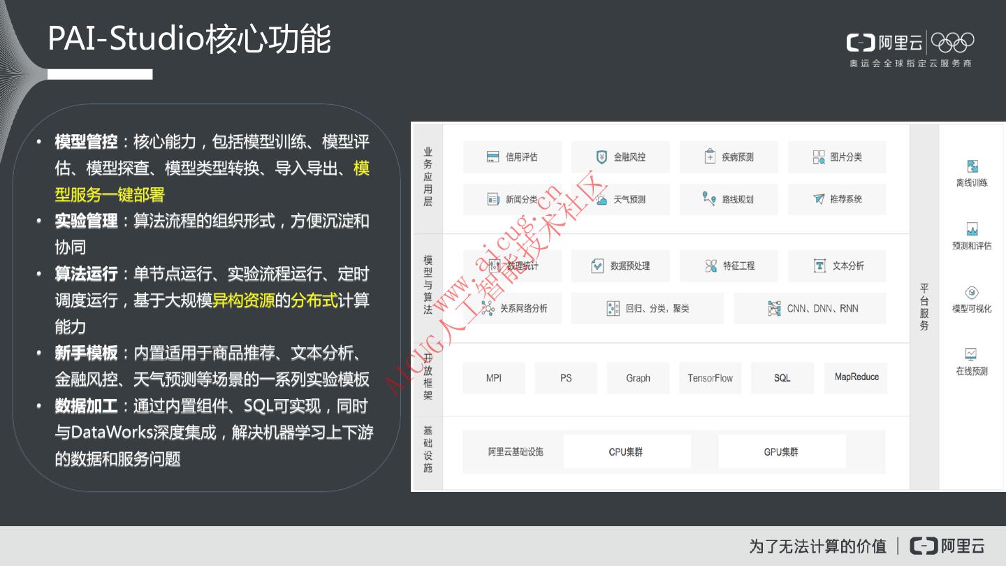 8 .PAI-Studio核心功能 • 模型管控:核心能力,包括模型训练、模型评 估、模型探查、模型类型转换、导入导出、模 区 型服务一键部署 术 cn 社 • 实验管理:算法流程的组织形式,方便沉淀和 技 g. 能 cu 协同 智 ai • 算法运行:单节点运行、实验流程运行、定时 工 . ww 调度运行,基于大规模异构资源的分布式计算 G人 w 能力 • 新手模板:内置适用于商品推荐、文本分析、 CU 金融风控、天气预测等场景的一系列实验模板 AI • 数据加工:通过内置组件、SQL可实现,同时 与DataWorks深度集成,解决机器学习上下游 的数据和服务问题