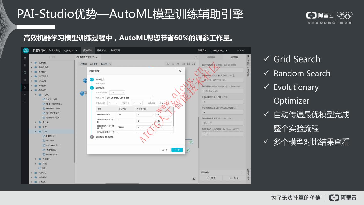11 .PAI-Studio优势—AutoML模型训练辅助引擎 高效机器学习模型训练过程中,AutoML帮您节省60%的调参工作量。 ü Grid Search 区 ü Random Search 术 cn 社 技 g. ü Evolutionary 能 cu 智 ai Optimizer 工 . ww ü 自动传递最优模型完成 G人 w 整个实验流程 CU AI ü 多个模型对比结果查看