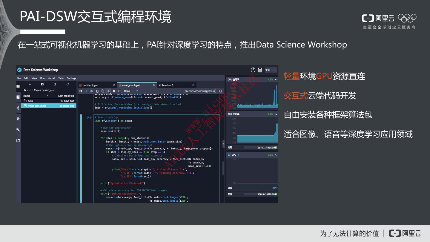 16 .PAI-DSW交互式编程环境 在一站式可视化机器学习的基础上,PAI针对深度学习的特点,推出Data Science Workshop 轻量环境GPU资源直连 区 术 cn 社 交互式云端代码开发 技 g. 能 cu 智 ai 自由安装各种框架算法包 工 . ww 适合图像、语音等深度学习应用领域 G人 w CU AI