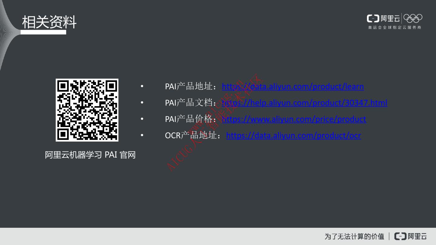 21 .相关资料 区 • PAI产品地址:https://data.aliyun.com/product/learn 术 cn 社 技 g. • PAI产品文档:https://help.aliyun.com/product/30347.html 能 cu 智 ai • PAI产品价格:https://www.aliyun.com/price/product 工 . ww • OCR产品地址:https://data.aliyun.com/product/ocr G人 w 阿里云机器学习 PAI 官网 CU AI