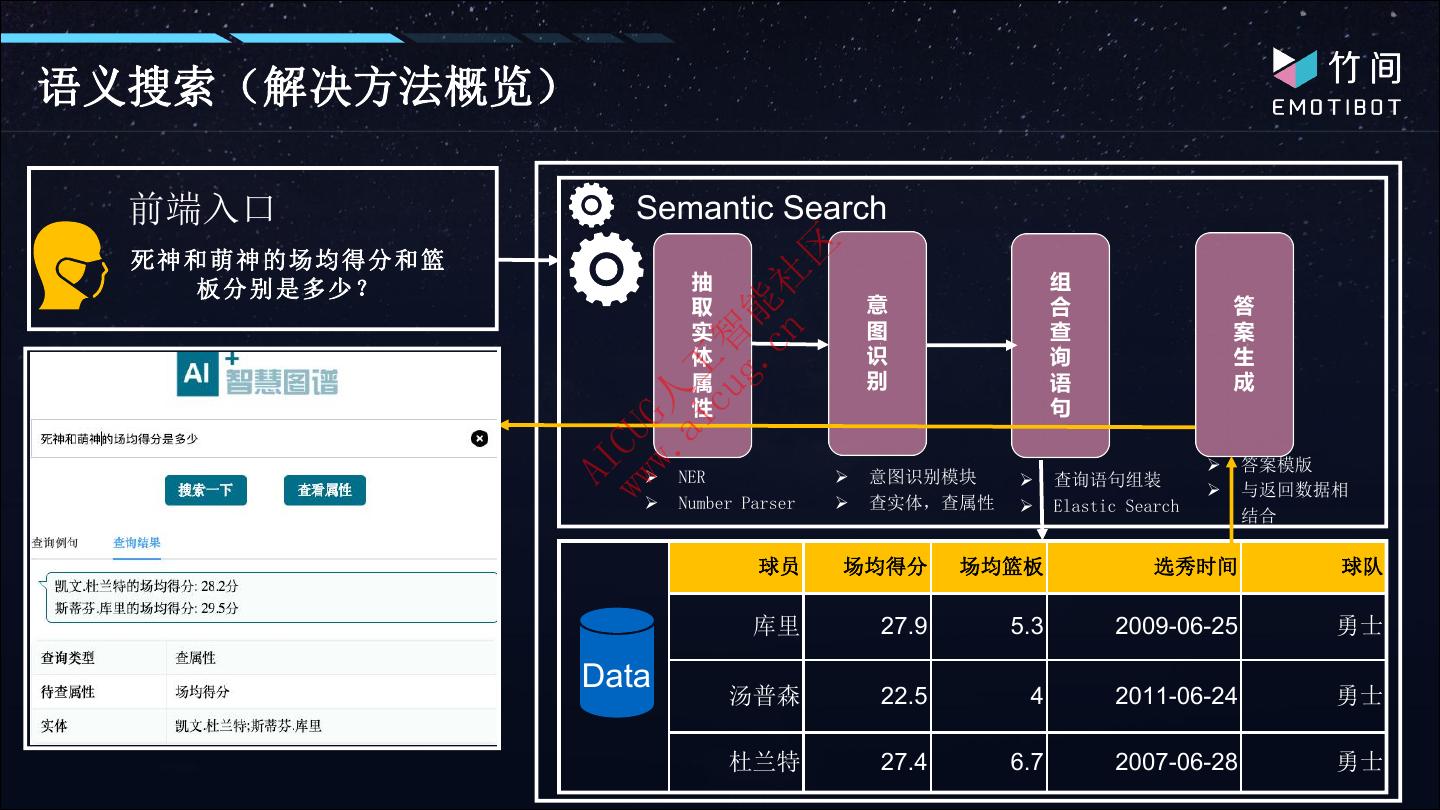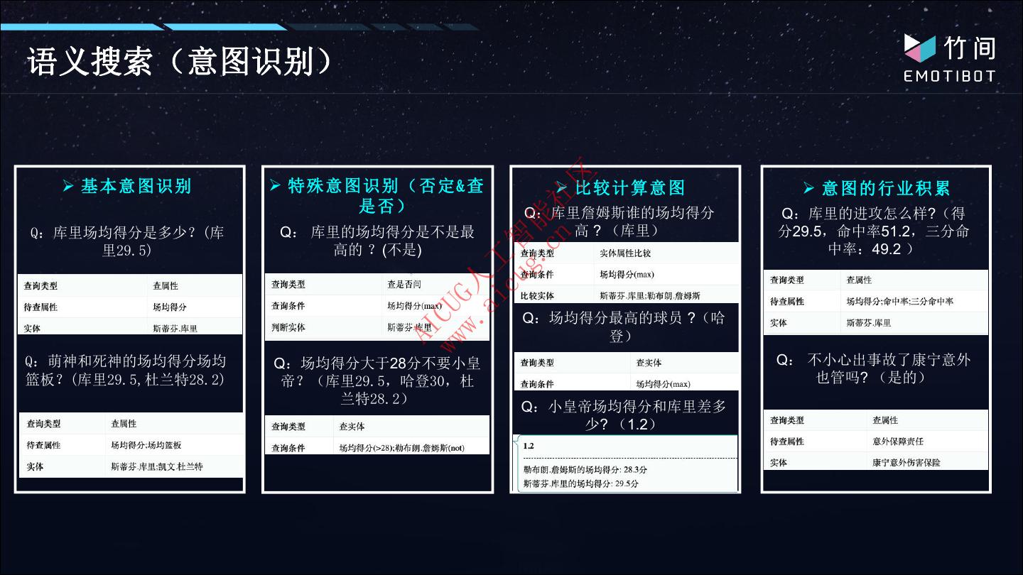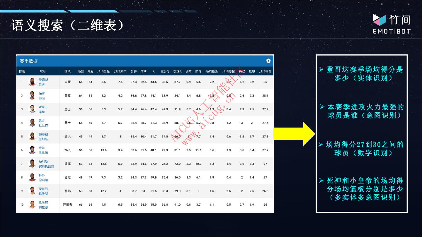 2 .语义搜索(二维表) Ø 登哥这赛季场均得分是 区 多少(实体识别) cn 社 g. 能 cu 智 Ø 本赛季进攻火力最强的 ai 工 球员是谁(意图识别) w. G人 ww CU AI Ø 场均得分27到30之间的 球员(数字识别) Ø 死神和小皇帝的场均得 分场均篮板分别是多少 (多实体多意图识别)