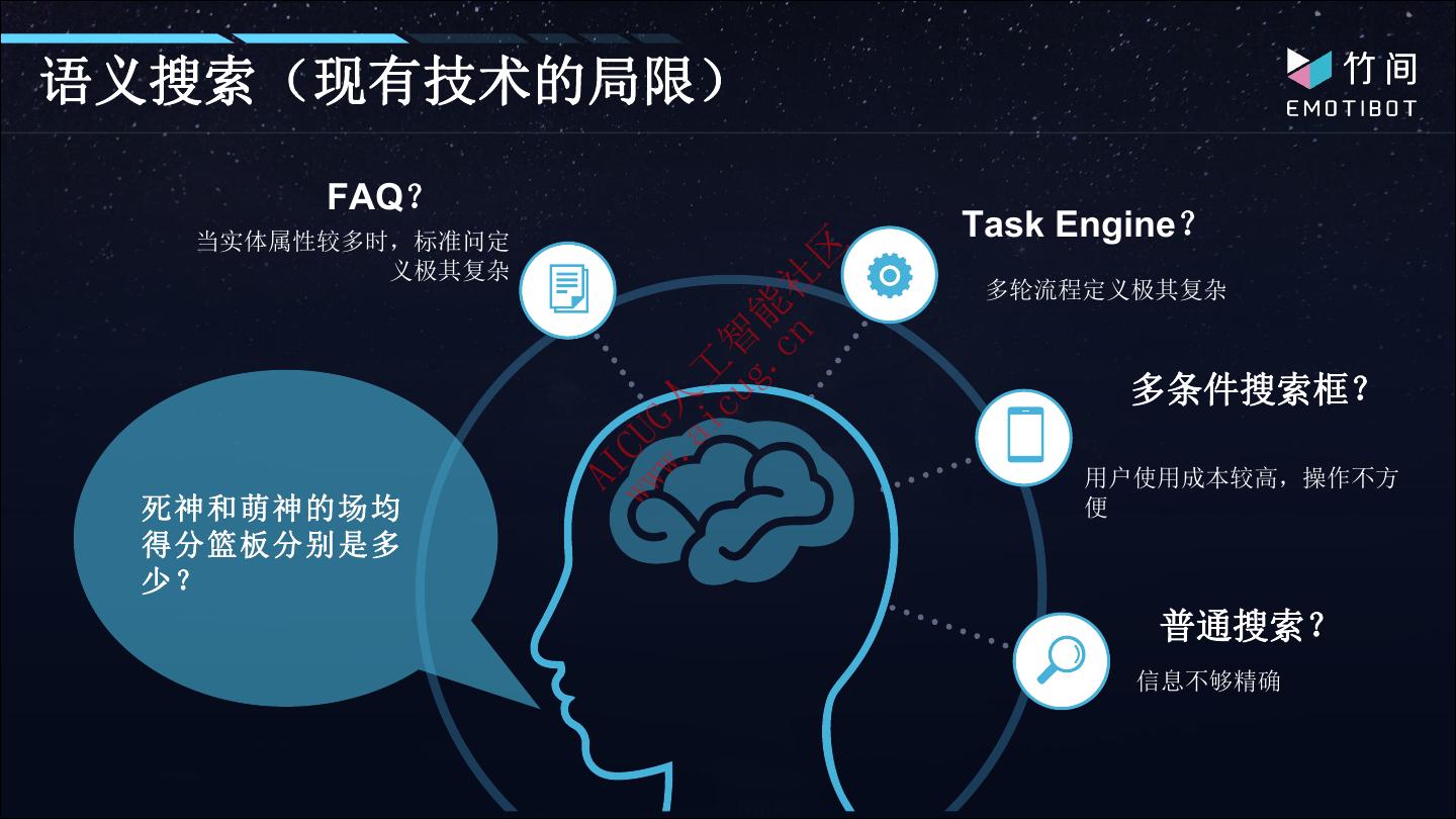 3 .语义搜索(现有技术的局限) FAQ? 当实体属性较多时,标准问定 Task Engine? 区 义极其复杂 cn 社 多轮流程定义极其复杂 g. 能 cu 智 ai 工 多条件搜索框? w. G人 ww CU AI 用户使用成本较高,操作不方 死神和萌神的场均 便 得分篮板分别是多 少? 普通搜索? 信息不够精确