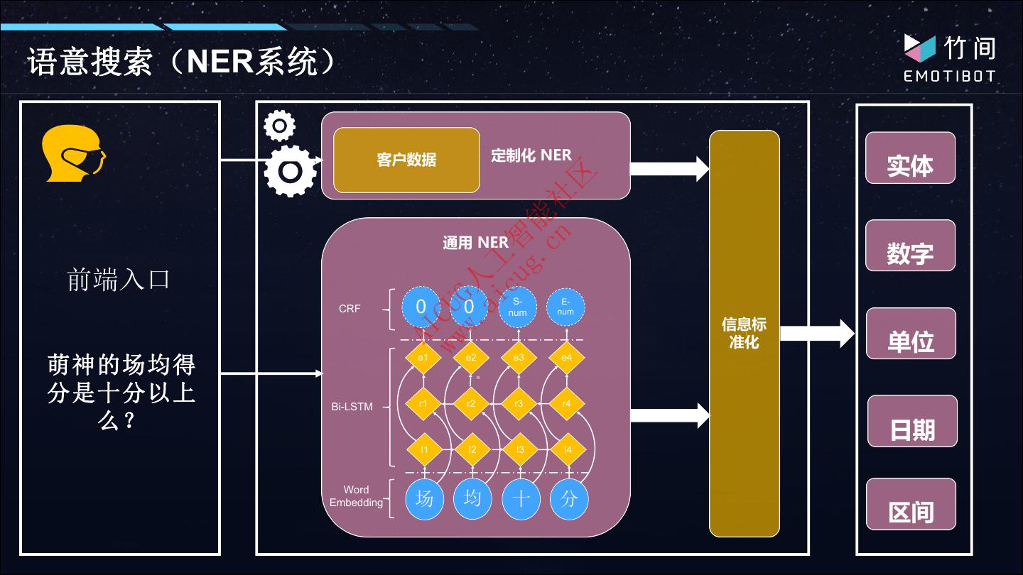 5 .语意搜索(NER系统) 客户数据 定制化 NER 实体 区 cn 社 g. 能 cu 智 通用 NER 数字 ai 工 前端入口 w. G人 CRF 0 0 S- E- ww CU num num 信息标 单位 AI 准化 e1 e2 e3 e4 萌神的场均得 分是十分以上 Bi-LSTM r1 r2 r3 r4 么? 日期 I1 I2 I3 I4 Word Embedding 场 均 十 分 区间