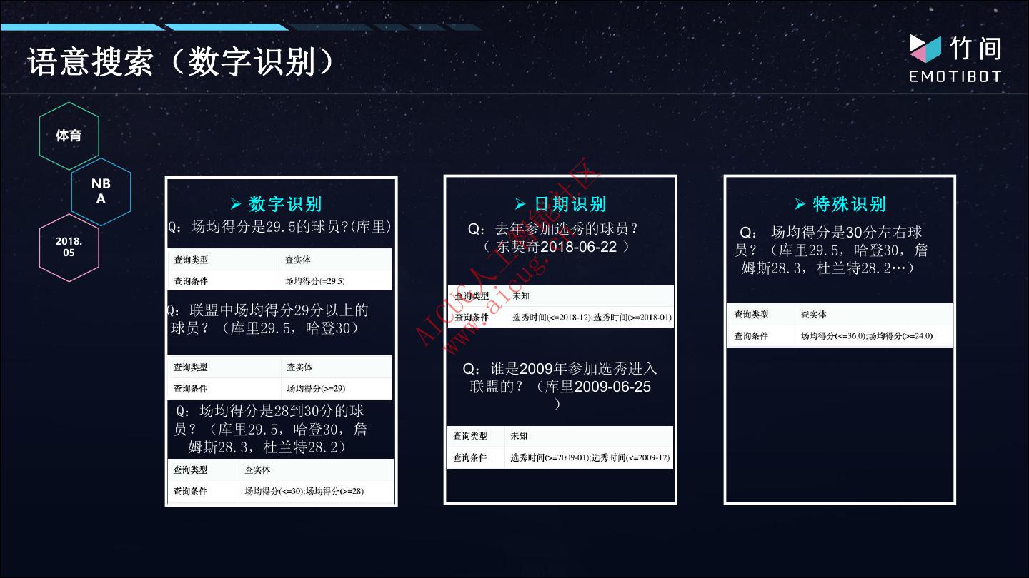 6 .语意搜索(数字识别) 体育 区 NB A cn 社 Ø 数字识别 Ø 日期识别 Ø 特殊识别 g. 能 Q:场均得分是29.5的球员?(库里) Q:去年参加选秀的球员? Q: 场均得分是30分左右球 cu 智 2018. 05 ( 东契奇2018-06-22 ) 员?(库里29.5,哈登30,詹 ai 工 姆斯28.3,杜兰特28.2…) w. G人 Q:联盟中场均得分29分以上的 ww CU 球员?(库里29.5,哈登30) AI Q:谁是2009年参加选秀进入 联盟的?(库里2009-06-25 Q:场均得分是28到30分的球 ) 员?(库里29.5,哈登30,詹 姆斯28.3,杜兰特28.2)