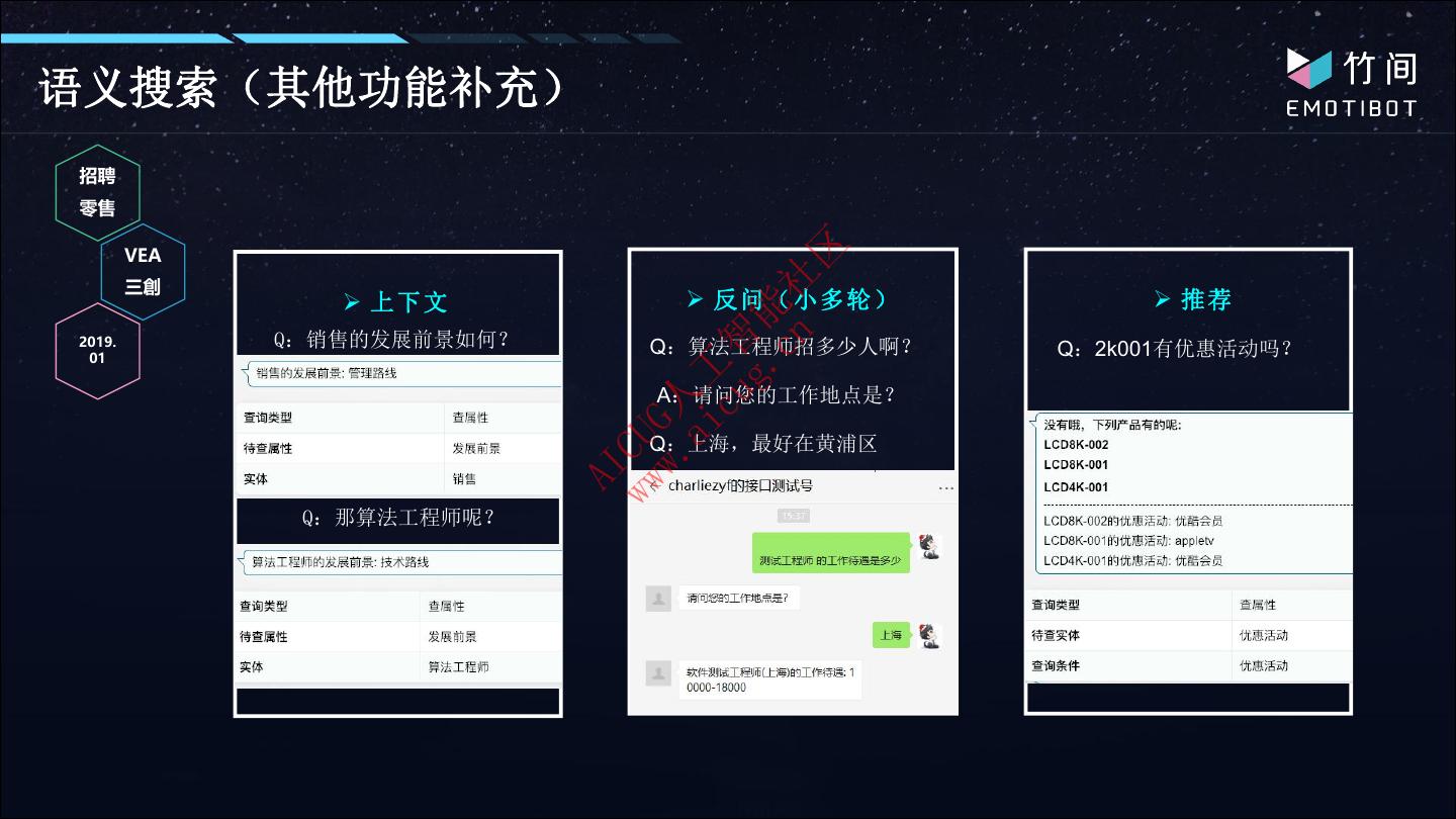 9 .语义搜索(其他功能补充) 招聘 零售 区 VEA cn 社 三創 Ø 上下文 Ø 反问(小多轮) Ø 推荐 g. 能 Q:销售的发展前景如何? cu 智 2019. 01 Q:算法工程师招多少人啊? Q:2k001有优惠活动吗? ai 工 A:请问您的工作地点是? w. G人 Q:上海,最好在黄浦区 ww CU AI Q:那算法工程师呢?