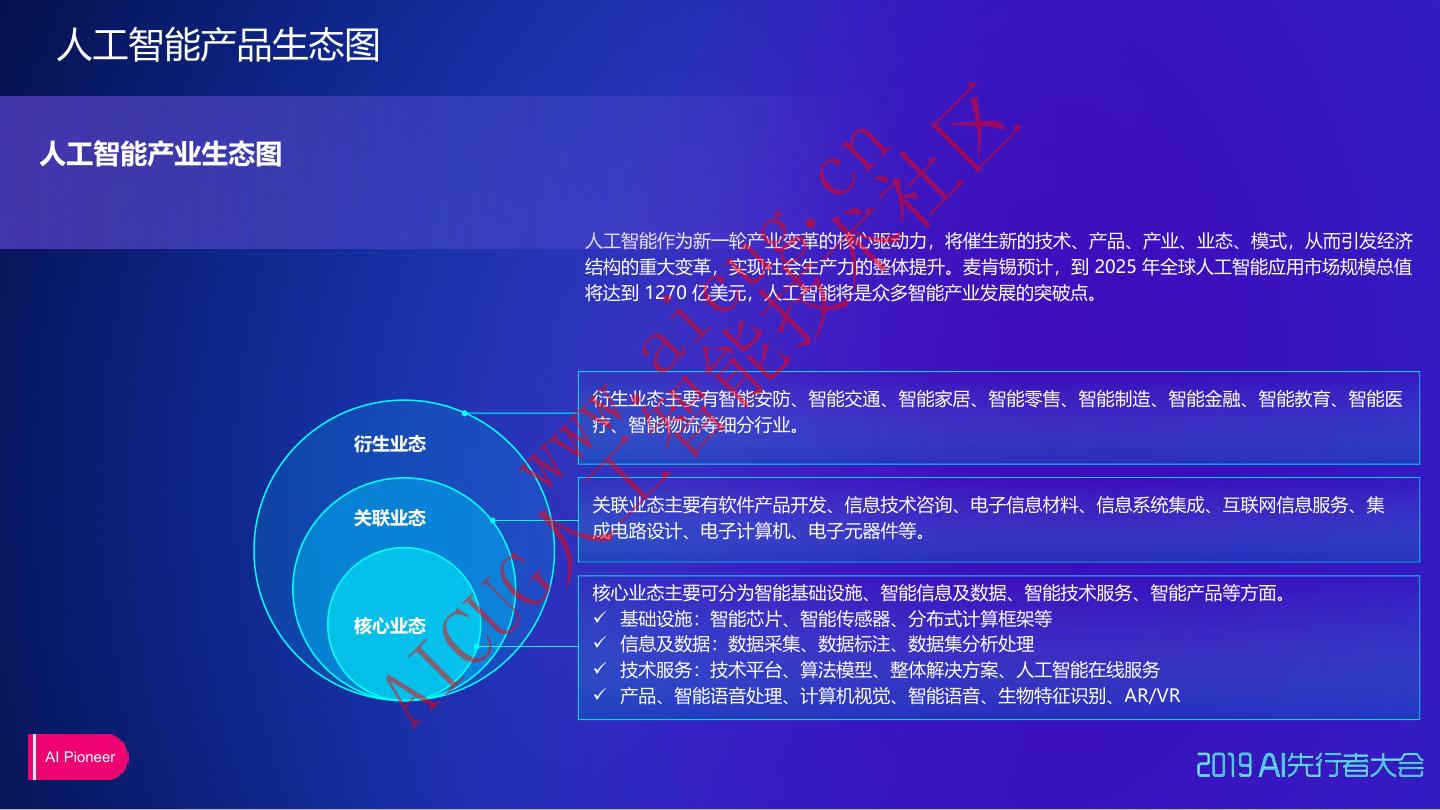 3 . 人工智能产品生态图 区 人工智能产业生态图 术 cn 社 技 g. 人工智能作为新一轮产业变革的核心驱动力,将催生新的技术、产品、产业、业态、模式,从而引发经济 结构的重大变革,实现社会生产力的整体提升。麦肯锡预计,到 2025 年全球人工智能应用市场规模总值 能 cu 将达到 1270 亿美元,人工智能将是众多智能产业发展的突破点。 智 ai 工 . 衍生业态主要有智能安防、智能交通、智能家居、智能零售、智能制造、智能金融、智能教育、智能医 ww 疗、智能物流等细分行业。 衍生业态 关联业态 G人 w 关联业态主要有软件产品开发、信息技术咨询、电子信息材料、信息系统集成、互联网信息服务、集 成电路设计、电子计算机、电子元器件等。 核心业态主要可分为智能基础设施、智能信息及数据、智能技术服务、智能产品等方面。 核心业态 ü 基础设施:智能芯片、智能传感器、分布式计算框架等 CU ü 信息及数据:数据采集、数据标注、数据集分析处理 ü 技术服务:技术平台、算法模型、整体解决方案、人工智能在线服务 AI ü 产品、智能语音处理、计算机视觉、智能语音、生物特征识别、AR/VR AI Pioneer