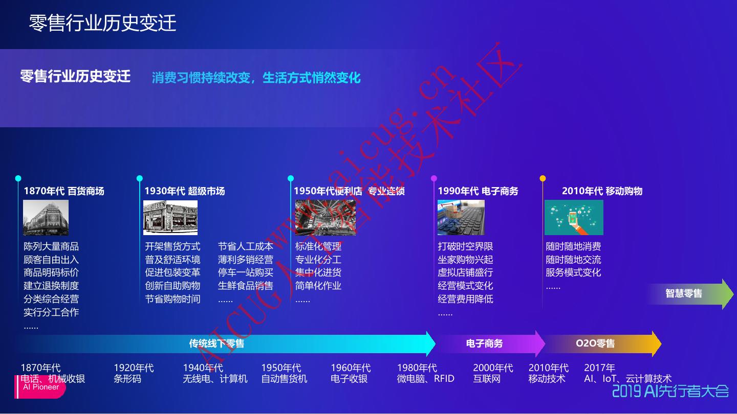 4 . 零售行业历史变迁 区 零售行业历史变迁 消费习惯持续改变,生活方式悄然变化 术 cn 社 技 g. 能 cu 智 ai 1870年代 百货商场 1930年代 超级市场 1950年代便利店 专业连锁 1990年代 电子商务 2010年代 移动购物 工 . ww G人 w 陈列大量商品 开架售货方式 节省人工成本 标准化管理 打破时空界限 随时随地消费 顾客自由出入 普及舒适环境 薄利多销经营 专业化分工 坐家购物兴起 随时随地交流 商品明码标价 促进包装变革 停车一站购买 集中化进货 虚拟店铺盛行 服务模式变化 建立退换制度 创新自助购物 生鲜食品销售 简单化作业 经营模式变化 …… 智慧零售 分类综合经营 节省购物时间 …… …… 经营费用降低 实行分工合作 …… CU …… 传统线下零售 电子商务 O2O零售 AI 1870年代 1920年代 1940年代 1950年代 1960年代 1980年代 2000年代 2010年代 2017年 电话、机械收银 条形码 无线电、计算机 自动售货机 电子收银 微电脑、RFID 互联网 移动技术 AI、IoT、云计算技术 AI Pioneer