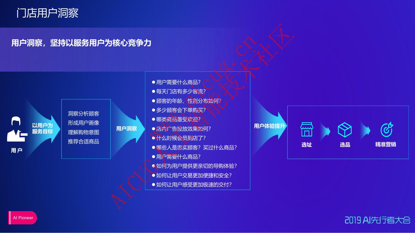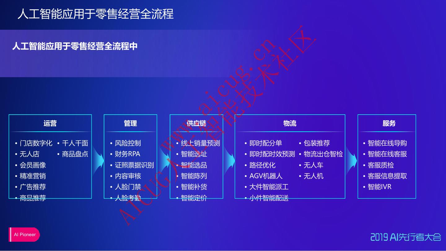 6 . 人工智能应用于零售经营全流程 区 术 cn 社 技 g. 能 cu 智 ai 用户洞察 智能选址 智能选品 门店运营 智能物流 智能配送 工 . ww G人 w CU AI AI Pioneer