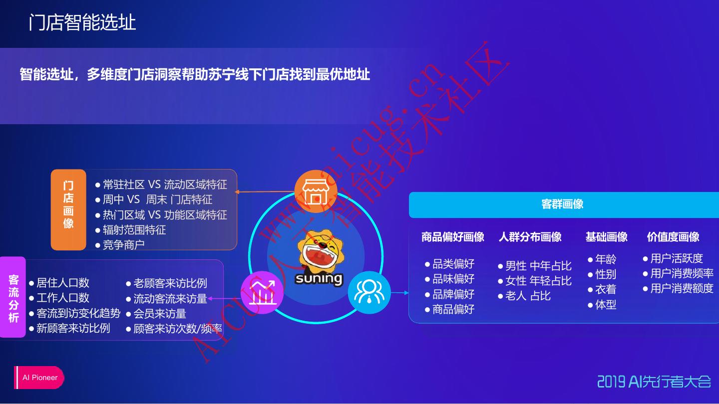 8 . 门店智能选址 区 智能选址,多维度门店洞察帮助苏宁线下门店找到最优地址 术 cn 社 技 g. 能 cu 智 ai 门 l 常驻社区 VS 流动区域特征 工 . 店 l 周中 VS 周末 门店特征 客群画像 画 ww l 热门区域 VS 功能区域特征 像 l 辐射范围特征 商品偏好画像 人群分布画像 基础画像 价值度画像 客 l 竞争商户 G人 w l 品类偏好 l 品味偏好 l 男性 中年占比 l 女性 年轻占比 l 年龄 l 性别 l 用户活跃度 l 用户消费频率 l 居住人口数 l 老顾客来访比例 l 衣着 l 用户消费额度 流 l 品牌偏好 l 老人 占比 l 工作人口数 l 流动客流来访量 分 l 体型 l 客流到访变化趋势 l 会员来访量 l 商品偏好 CU 析 l 新顾客来访比例 l 顾客来访次数/频率 AI AI Pioneer