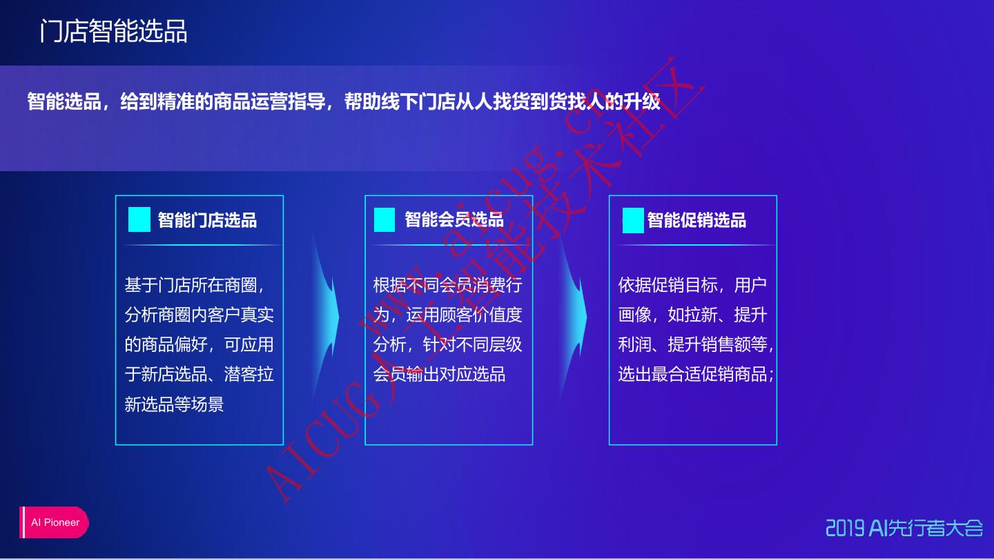 9 . 门店智能选品 区 智能选品,给到精准的商品运营指导,帮助线下门店从人找货到货找人的升级 术 cn 社 技 g. 能 cu 智能门店选品 智能会员选品 智能促销选品 智 ai 工 . 基于门店所在商圈, 根据不同会员消费行 依据促销目标,用户 ww 分析商圈内客户真实 为,运用顾客价值度 画像,如拉新、提升 的商品偏好,可应用 于新店选品、潜客拉 G人 w 分析,针对不同层级 会员输出对应选品 利润、提升销售额等, 选出最合适促销商品; 新选品等场景 CU AI AI Pioneer