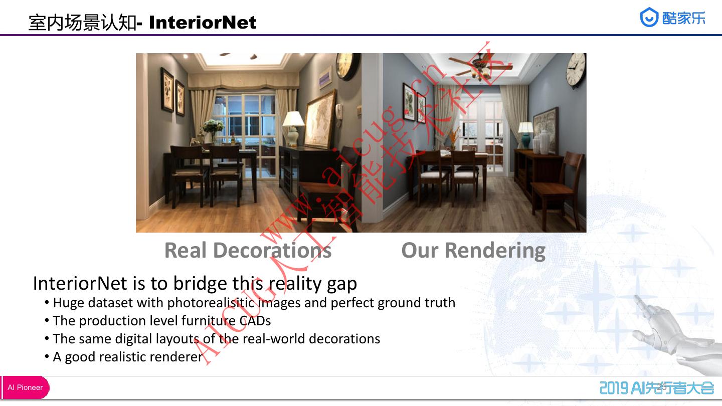 26 . 室内场景认知- InteriorNet 区 术 cn 社 技 g. 能 cu 智 ai 工 . ww Real Decorations G人 w Our Rendering InteriorNet is to bridge this reality gap • Huge dataset with photorealisitic images and perfect ground truth CU • The production level furniture CADs • The same digital layouts of the real-world decorations AI • A good realistic renderer AI Pioneer 25
