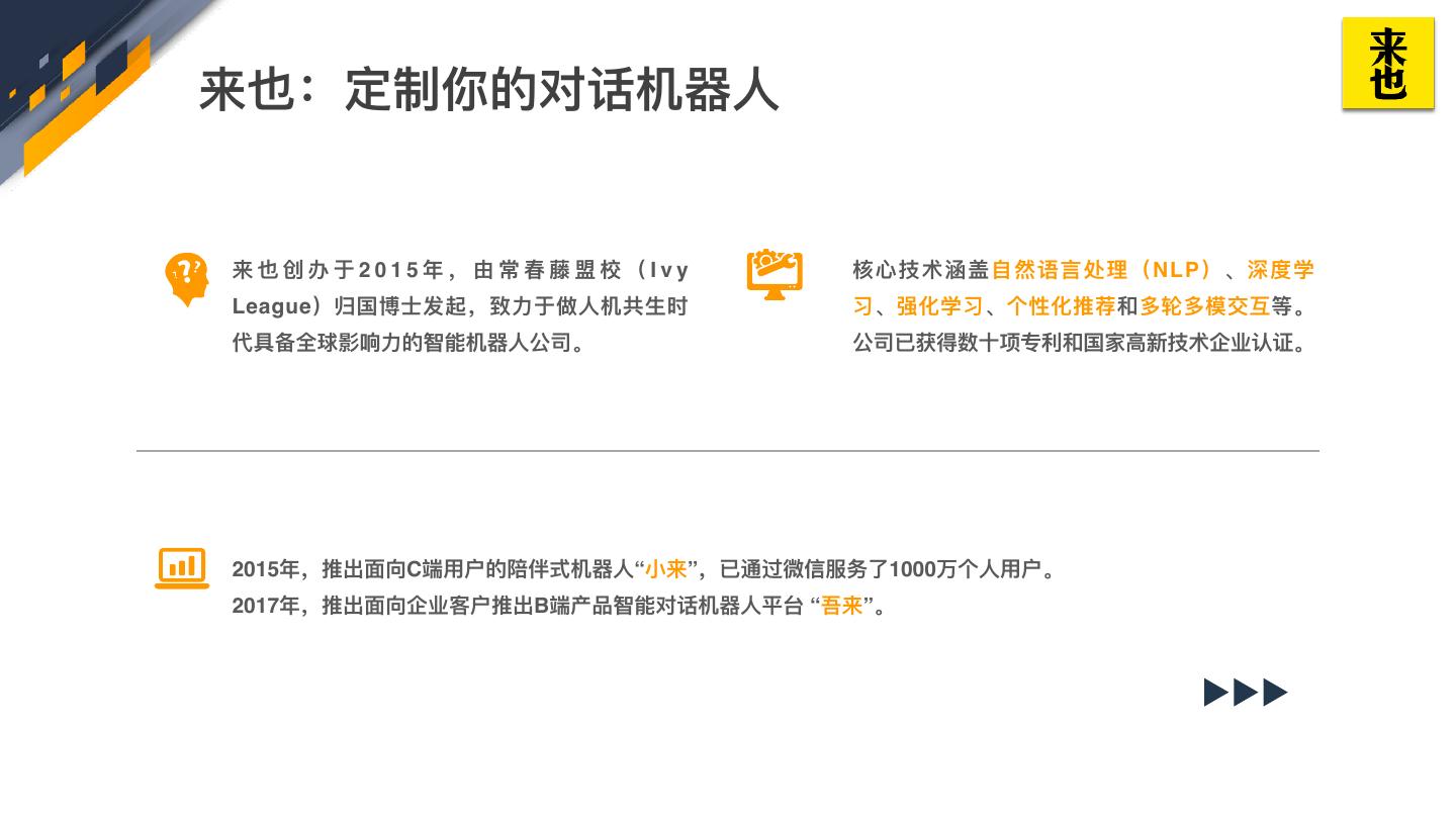 3 .来也:定制你的对话机器器⼈人 来 也 创 办 于 2 0 1 5 年年 , 由 常 春 藤 盟 校 ( I v y 核⼼心技术涵盖⾃自然语⾔言处理理(NLP)、深度学 League)归国博⼠士发起,致⼒力力于做⼈人机共⽣生时 习、强化学习、个性化推荐和多轮多模交互等。 代具备全球影响⼒力力的智能机器器⼈人公司。 公司已获得数⼗十项专利利和国家⾼高新技术企业认证。 2015年年,推出⾯面向C端⽤用户的陪伴式机器器⼈人“⼩小来”,已通过微信服务了了1000万个⼈人⽤用户。 2017年年,推出⾯面向企业客户推出B端产品智能对话机器器⼈人平台 “吾来”。