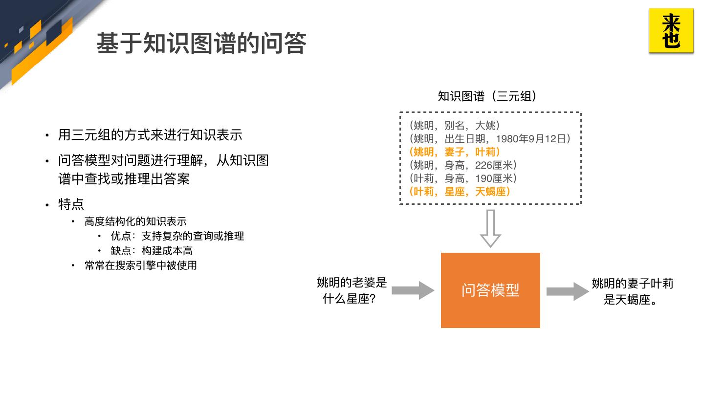 9 . 基于知识图谱的问答 知识图谱(三元组) (姚明,别名,⼤大姚) • ⽤用三元组的⽅方式来进⾏行行知识表示 (姚明,出⽣生⽇日期,1980年年9⽉月12⽇日) (姚明,妻⼦子,叶莉) • 问答模型对问题进⾏行行理理解,从知识图 (姚明,身⾼高,226厘⽶米) 谱中查找或推理理出答案 (叶莉,身⾼高,190厘⽶米) (叶莉,星座,天蝎座) • 特点 • ⾼高度结构化的知识表示 • 优点:⽀支持复杂的查询或推理理 • 缺点:构建成本⾼高 • 常常在搜索引擎中被使⽤用 姚明的⽼老老婆是 姚明的妻⼦子叶莉 问答模型 什什么星座? 是天蝎座。