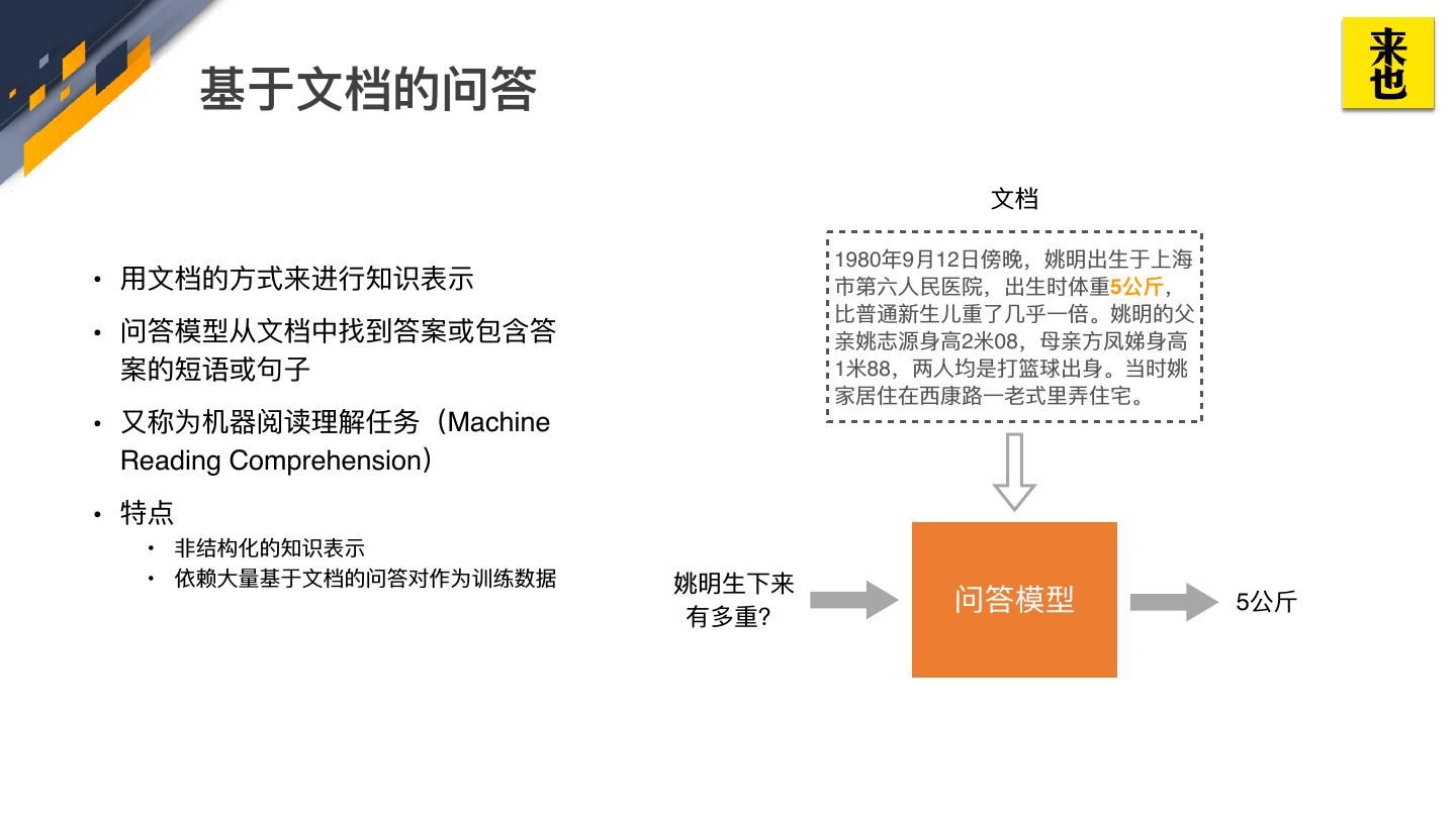 10 . 基于⽂文档的问答 ⽂文档 1980年年9⽉月12⽇日傍晚,姚明出⽣生于上海海 • ⽤用⽂文档的⽅方式来进⾏行行知识表示 市第六⼈人⺠民医院,出⽣生时体重5公⽄斤, ⽐比普通新⽣生⼉儿重了了⼏几乎⼀一倍。姚明的⽗父 • 问答模型从⽂文档中找到答案或包含答 亲姚志源身⾼高2⽶米08,⺟母亲⽅方凤娣身⾼高 案的短语或句句⼦子 1⽶米88,两⼈人均是打篮球出身。当时姚 家居住在⻄西康路路⼀一⽼老老式⾥里里弄弄住宅。 • ⼜又称为机器器阅读理理解任务(Machine Reading Comprehension) • 特点 • ⾮非结构化的知识表示 • 依赖⼤大量量基于⽂文档的问答对作为训练数据 姚明⽣生下来 问答模型 5公⽄斤 有多重?
