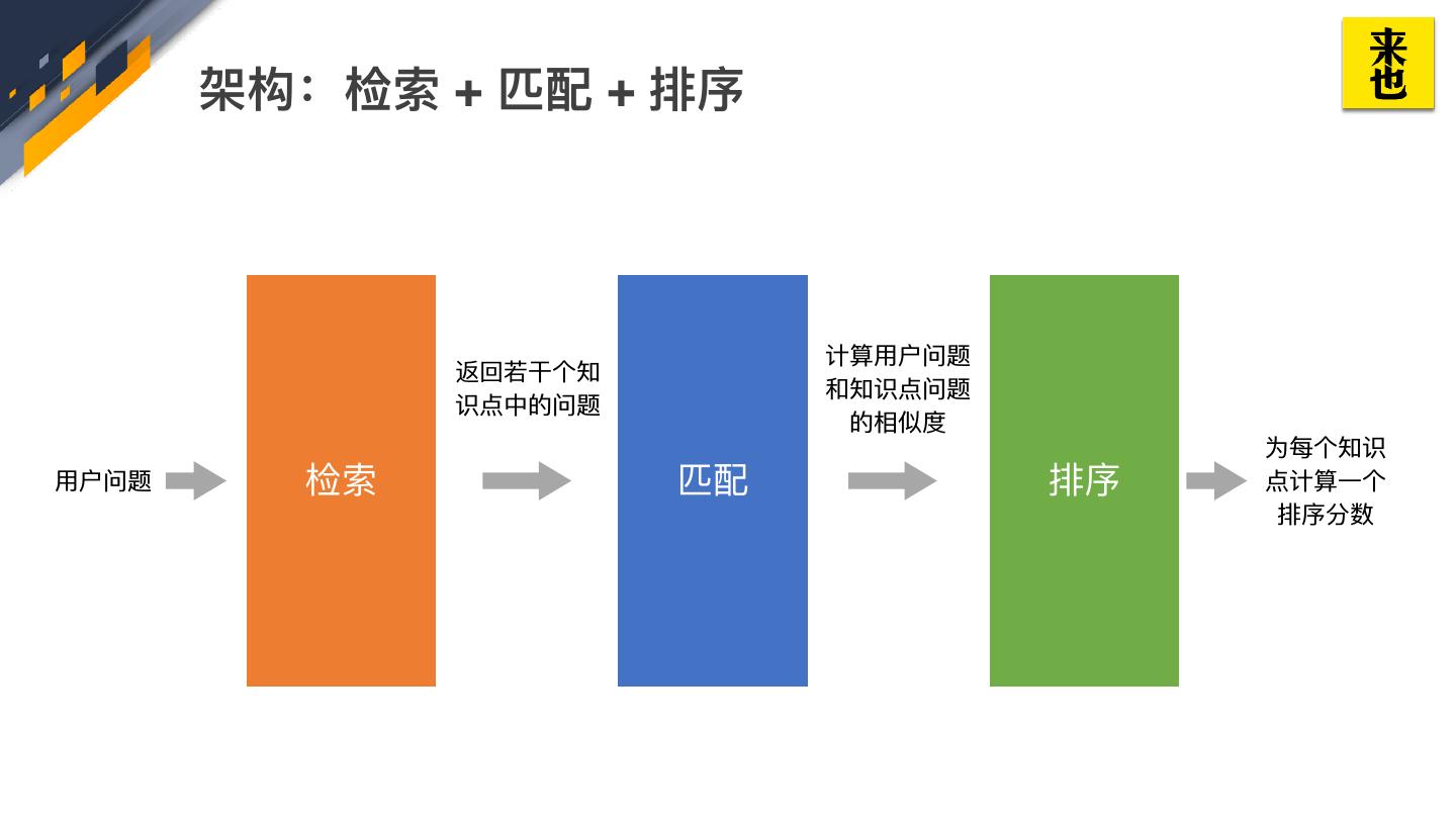 14 . 架构:检索 + 匹配 + 排序 计算⽤用户问题 返回若⼲干个知 和知识点问题 识点中的问题 的相似度 为每个知识 ⽤用户问题 检索 匹配 排序 点计算⼀一个 排序分数
