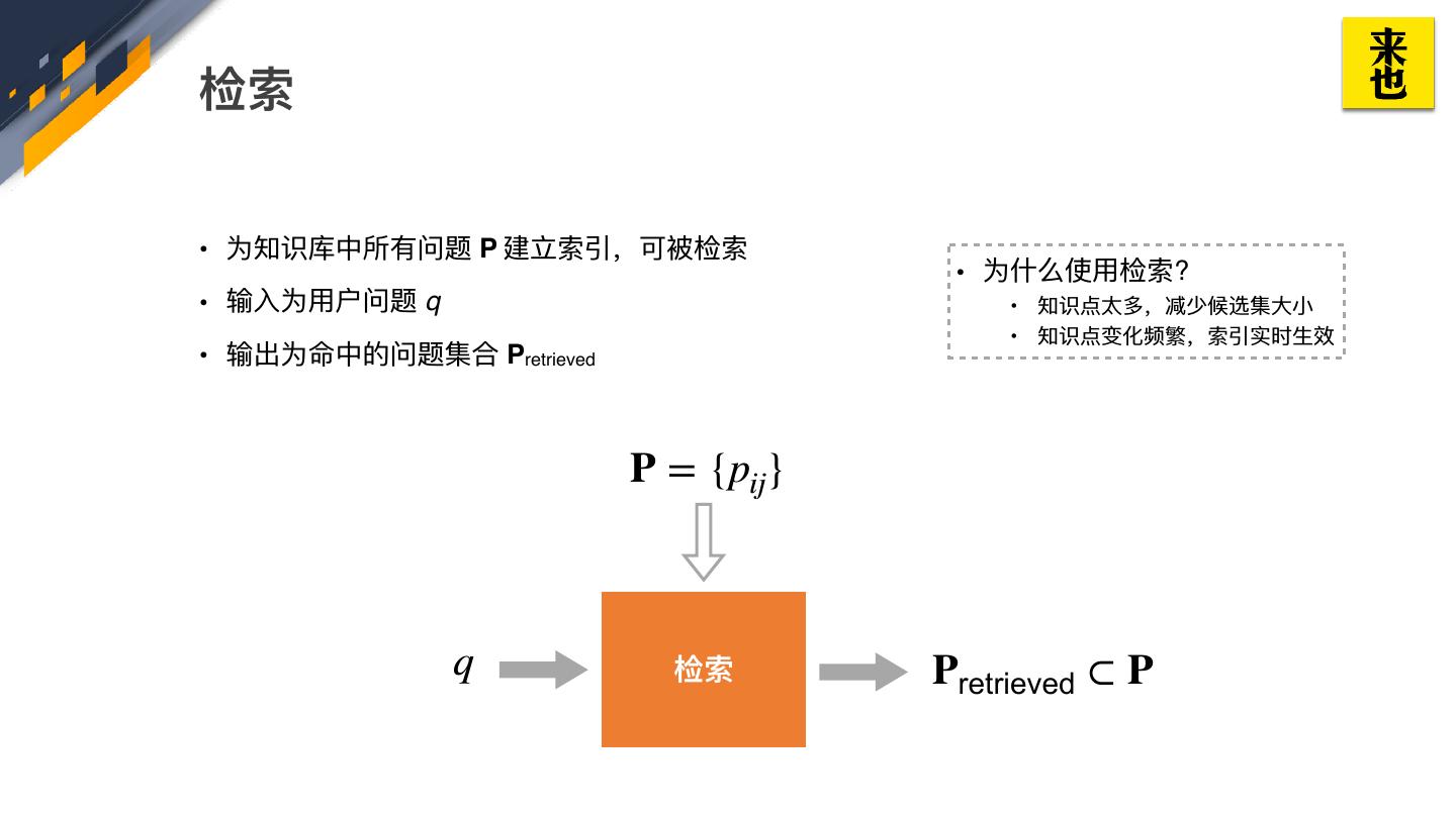 15 .检索 • 为知识库中所有问题 P 建⽴立索引,可被检索 • 为什什么使⽤用检索? • 输⼊入为⽤用户问题 q • 知识点太多,减少候选集⼤大⼩小 • 知识点变化频繁,索引实时⽣生效 • 输出为命中的问题集合 Pretrieved P = {pij} q 检索 Pretrieved ⊂ P