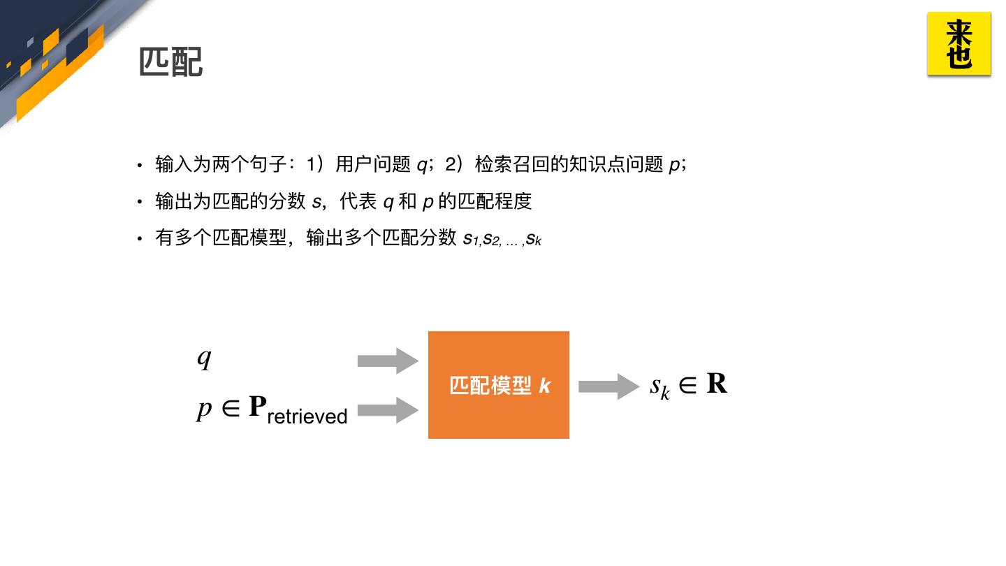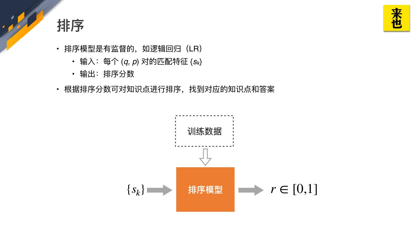 17 .排序 • 排序模型是有监督的,如逻辑回归(LR) • 输⼊入:每个 (q, p) 对的匹配特征 {sk} • 输出:排序分数 • 根据排序分数可对知识点进⾏行行排序,找到对应的知识点和答案 训练数据 {sk} 排序模型 r ∈ [0,1]