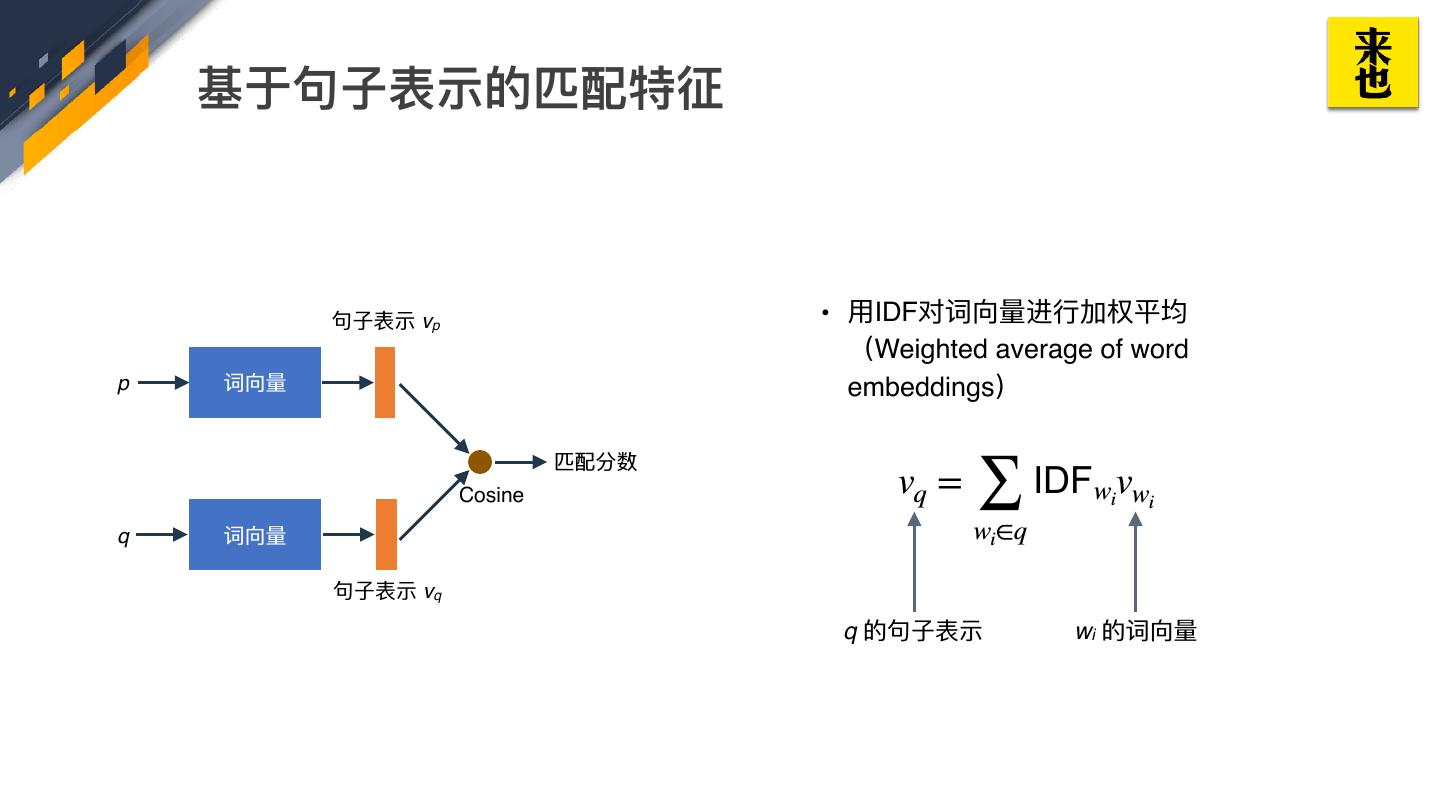 21 . 基于句句⼦子表示的匹配特征 句句⼦子表示 vp • ⽤用IDF对词向量量进⾏行行加权平均 (Weighted average of word p 词向量量 embeddings) 匹配分数 ∑ Cosine vq = IDFwivwi q 词向量量 wi∈q 句句⼦子表示 vq q 的句句⼦子表示 wi 的词向量量