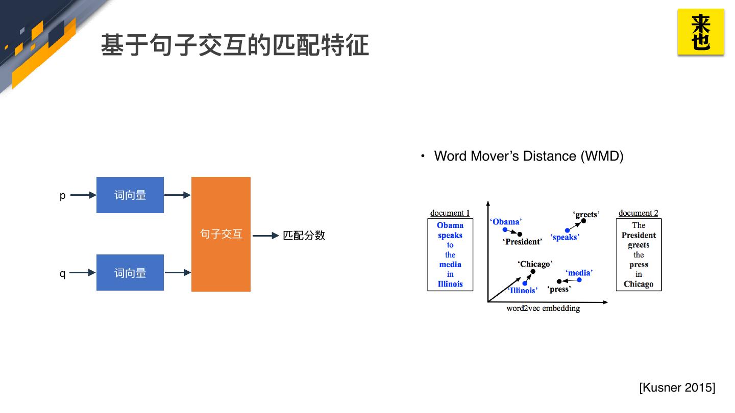 22 . 基于句句⼦子交互的匹配特征 • Word Mover’s Distance (WMD) p 词向量量 句句⼦子交互 匹配分数 q 词向量量 [Kusner 2015]