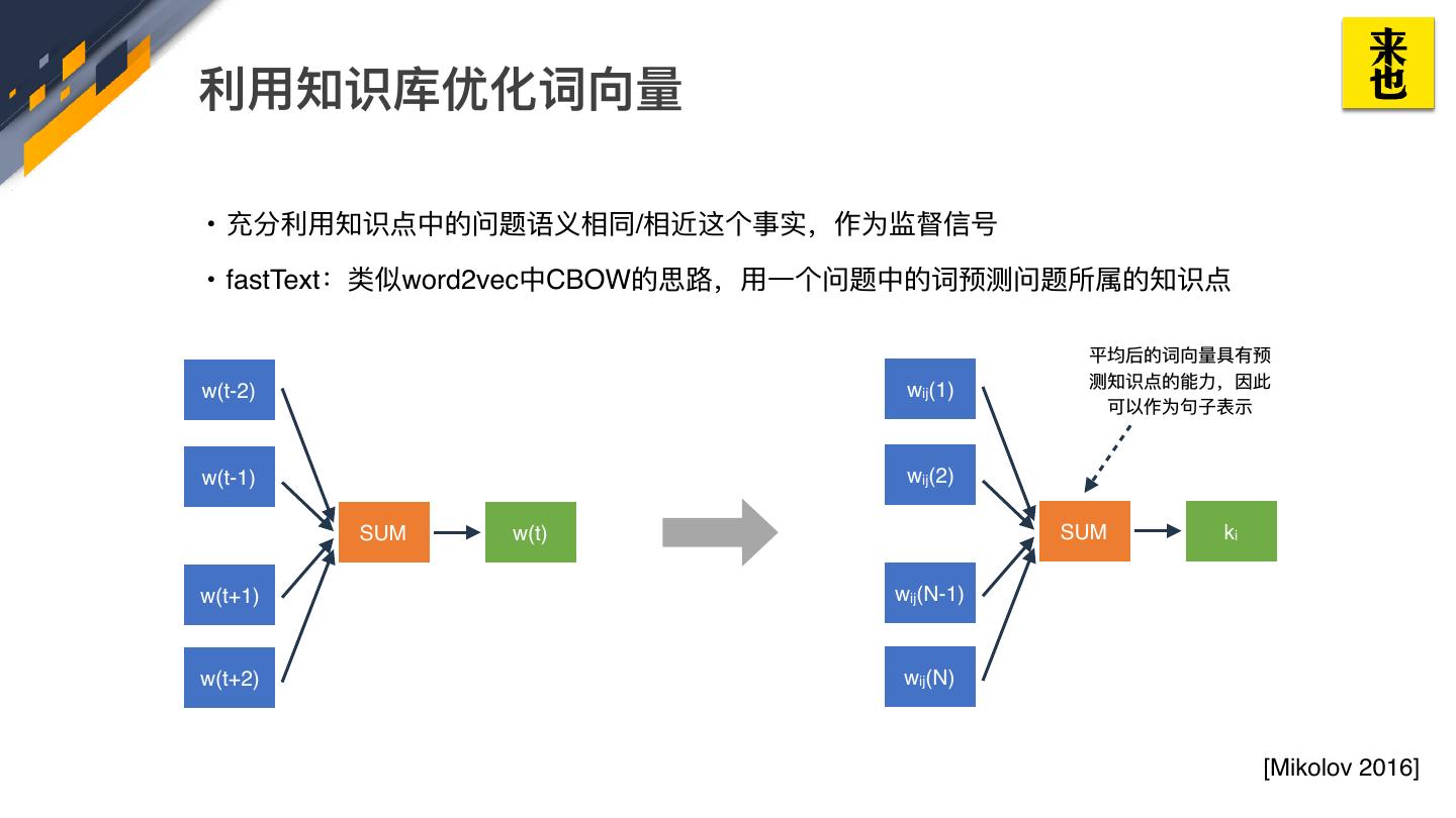 23 .利利⽤用知识库优化词向量量 • 充分利利⽤用知识点中的问题语义相同/相近这个事实,作为监督信号 • fastText:类似word2vec中CBOW的思路路,⽤用⼀一个问题中的词预测问题所属的知识点 平均后的词向量量具有预 测知识点的能⼒力力,因此 w(t-2) wij(1) 可以作为句句⼦子表示 w(t-1) wij(2) SUM w(t) SUM ki w(t+1) wij(N-1) w(t+2) wij(N) [Mikolov 2016]