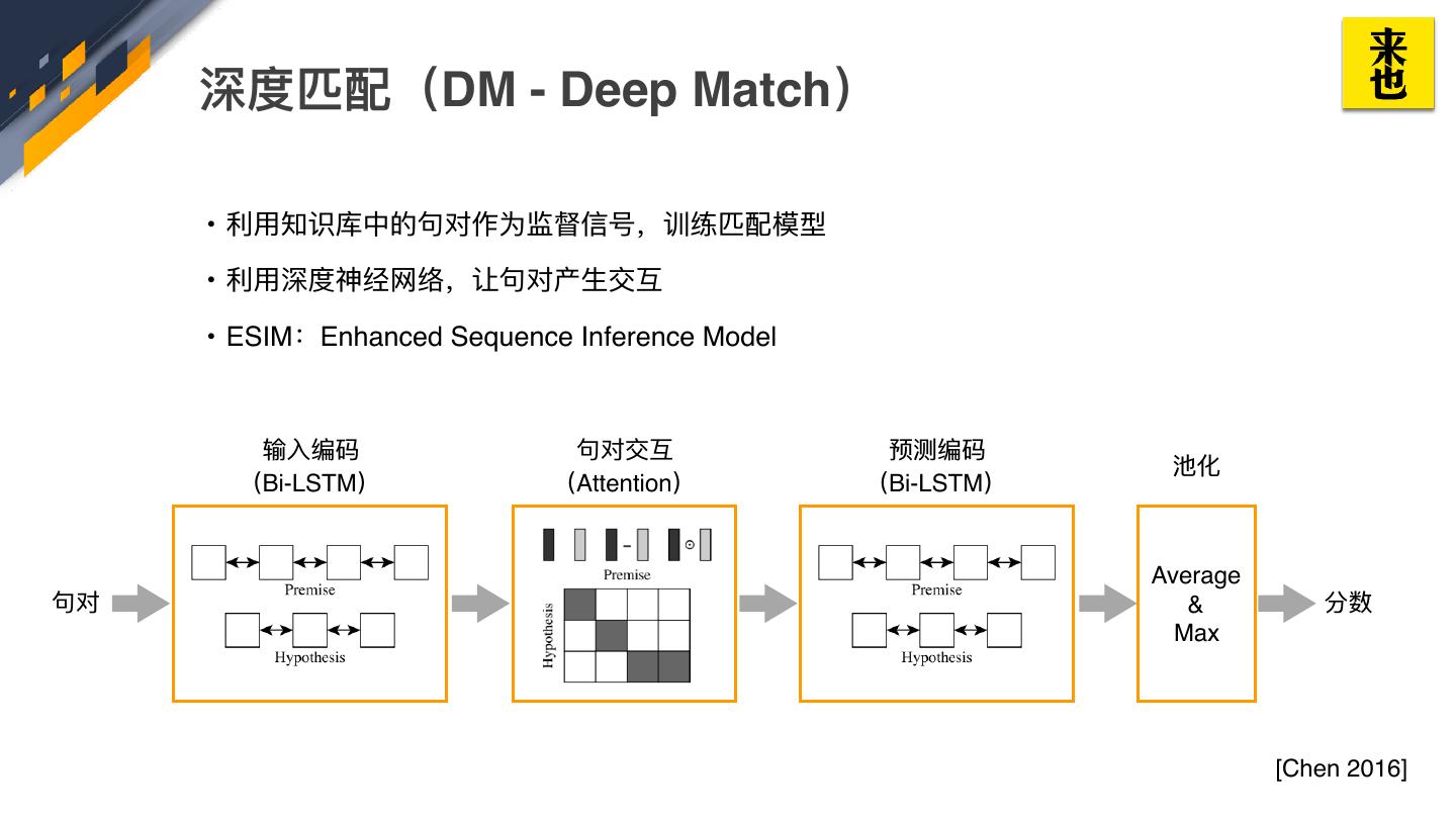 24 . 深度匹配(DM - Deep Match) • 利利⽤用知识库中的句句对作为监督信号,训练匹配模型 • 利利⽤用深度神经⽹网络,让句句对产⽣生交互 • ESIM:Enhanced Sequence Inference Model 输⼊入编码 句句对交互 预测编码 池化 (Bi-LSTM) (Attention) (Bi-LSTM) Average 句句对 & 分数 Max [Chen 2016]