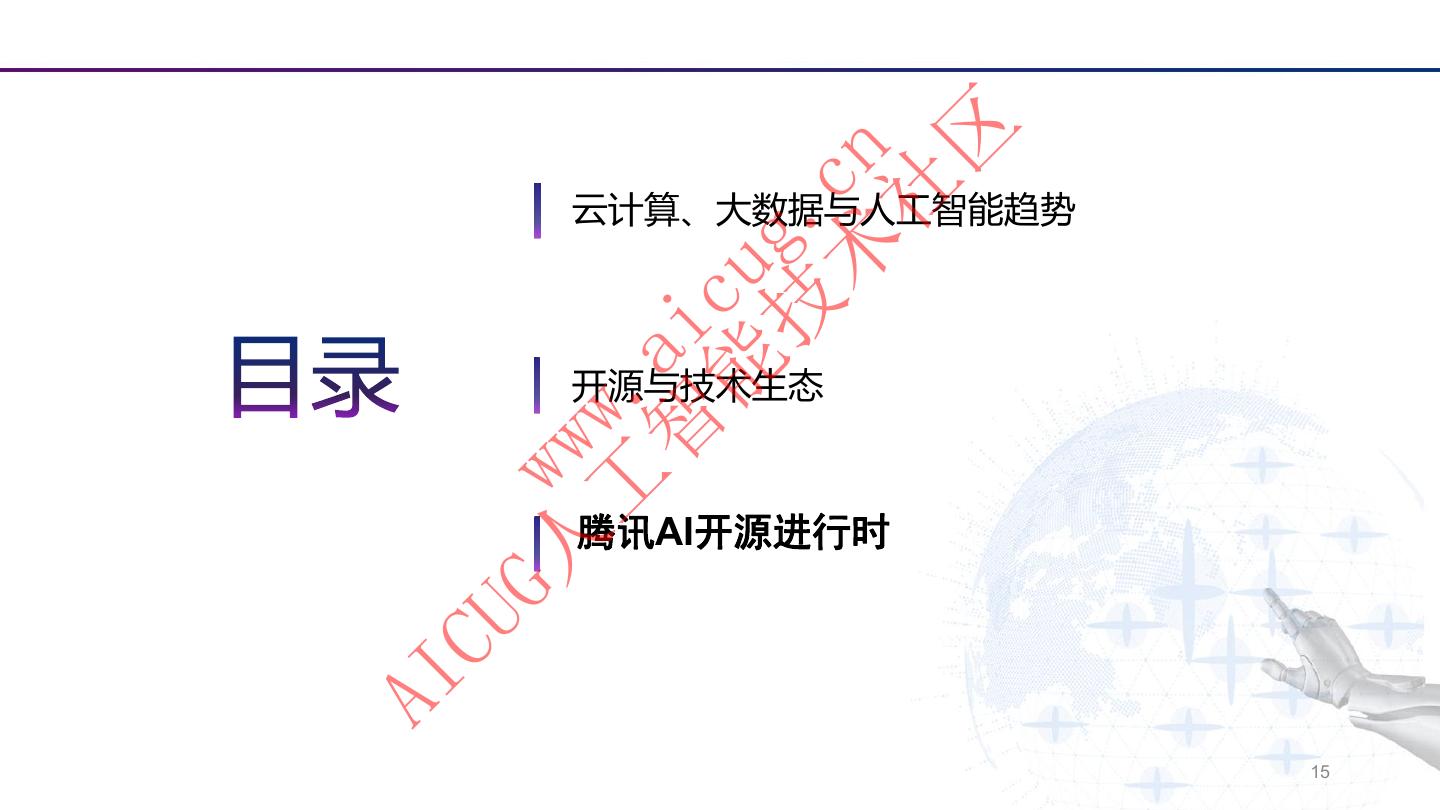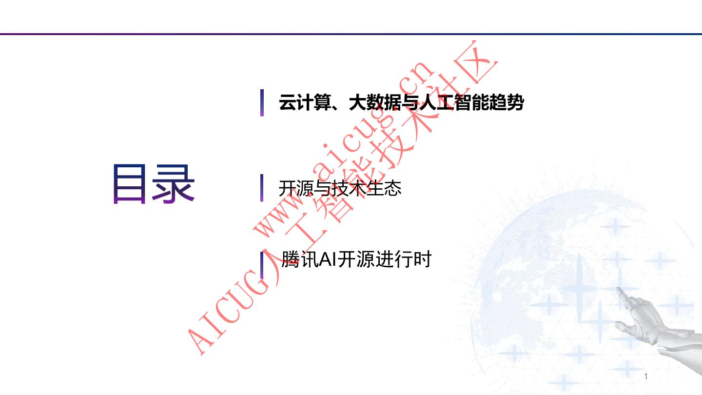 2 . 区 术 cn 社 云计算、大数据与人工智能趋势 技 g. 能 cu 智 ai 开源与技术生态 工 . ww G人 w 腾讯AI开源进行时 CU AI 1