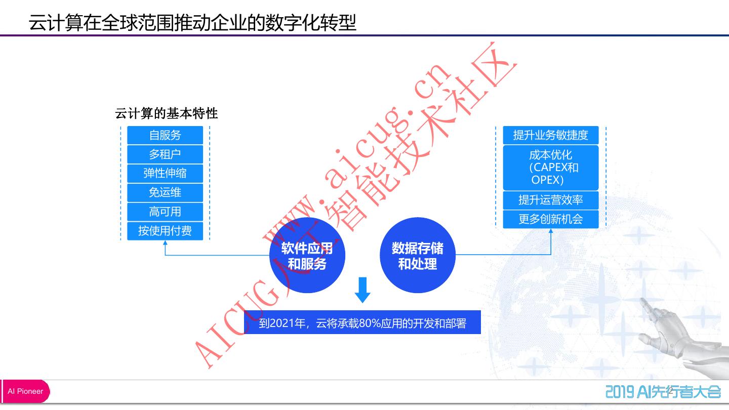 3 . 云计算在全球范围推动企业的数字化转型 区 术 cn 社 技 g. 云计算的基本特性 自服务 提升业务敏捷度 能 cu 多租户 成本优化 (CAPEX和 智 ai 弹性伸缩 OPEX) 免运维 工 . 提升运营效率 高可用 ww 更多创新机会 按使用付费 G人 w 软件应用 和服务 数据存储 和处理 CU 到2021年,云将承载80%应用的开发和部署 AI AI Pioneer 2