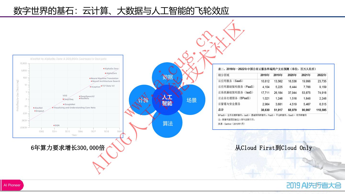 4 . 数字世界的基石:云计算、大数据与人工智能的飞轮效应 区 术 cn 社 技 g. 能 cu 数据 智 ai 工 . 人工 计算 场景 ww 智能 G人 w 算法 6年算力要求增长300,000倍 从Cloud First到Cloud Only CU AI AI Pioneer 3