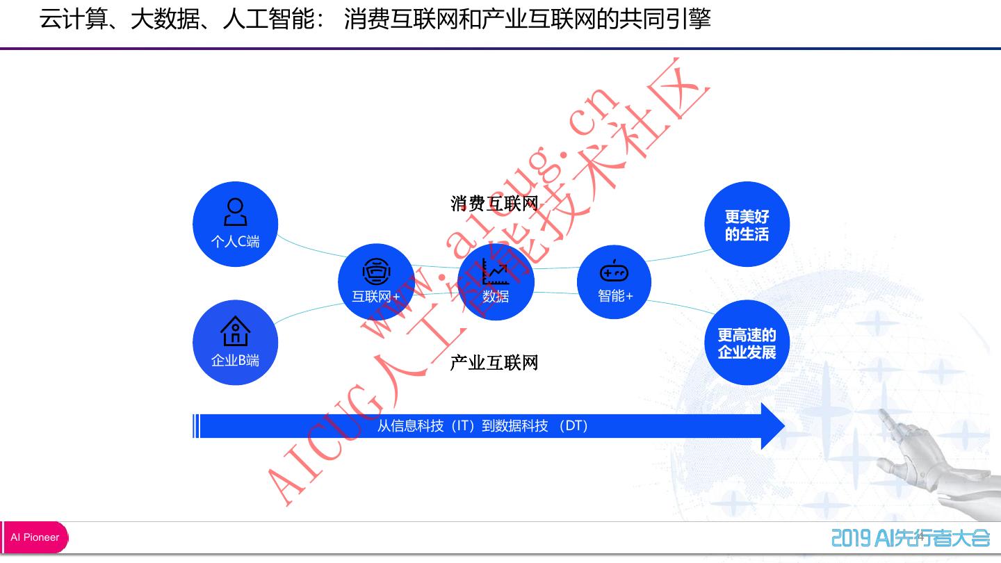 5 . 云计算、大数据、人工智能: 消费互联网和产业互联网的共同引擎 区 术 cn 社 技 g. 能 cu 消费互联网 更美好 的生活 智 ai 个人C端 工 . ww 互联网+ 数据 智能+ 更高速的 企业B端 G人 w 产业互联网 企业发展 从信息科技(IT)到数据科技 (DT) CU AI AI Pioneer 4