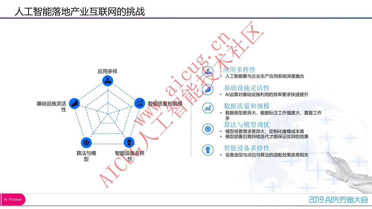 6 . 人工智能落地产业互联网的挑战 区 术 cn 社 技 g. 应用多样 应用多样性 能 cu 性 • 人工智能要与企业生产应用系统深度融合 智 ai 基础设施灵活性 • AI运算对基础设施利用的效率要求快速提升 工 . 基础设施灵活 数据质量和规模 数据质量和规模 ww 性 • 数据类型差异大,数据标注工作强度大、重复工作 多 G人 w 算法与模型调优 • 模型场景需求差异大,定制化建模成本高 • 模型部署后需持续迭代才能保证优异的效果 智能设备多样性 算法与模 智能设备多样 • 设备选型与点位与算法的适配效果息息相关 型 性 CU AI AI Pioneer 5