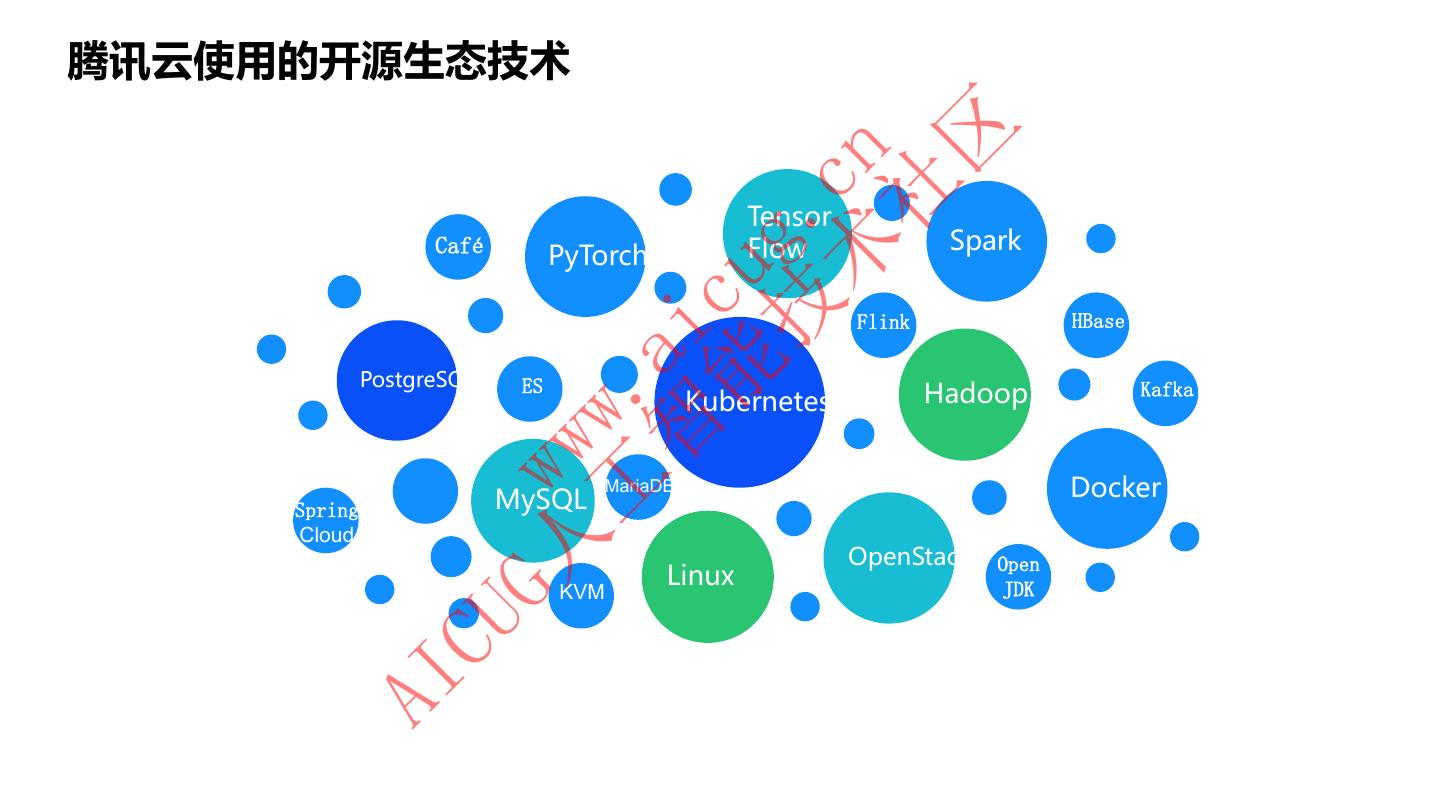 14 .腾讯云使用的开源生态技术 区 术 cn 社 Tensor 技 g. Café Flow Spark PyTorch 能 cu Flink HBase 智 ai PostgreSQL ES Hadoop Kafka 工 . Kubernetes ww Spring Cloud G人 w MySQL MariaDB OpenStack Open Docker Linux KVM JDK CU AI