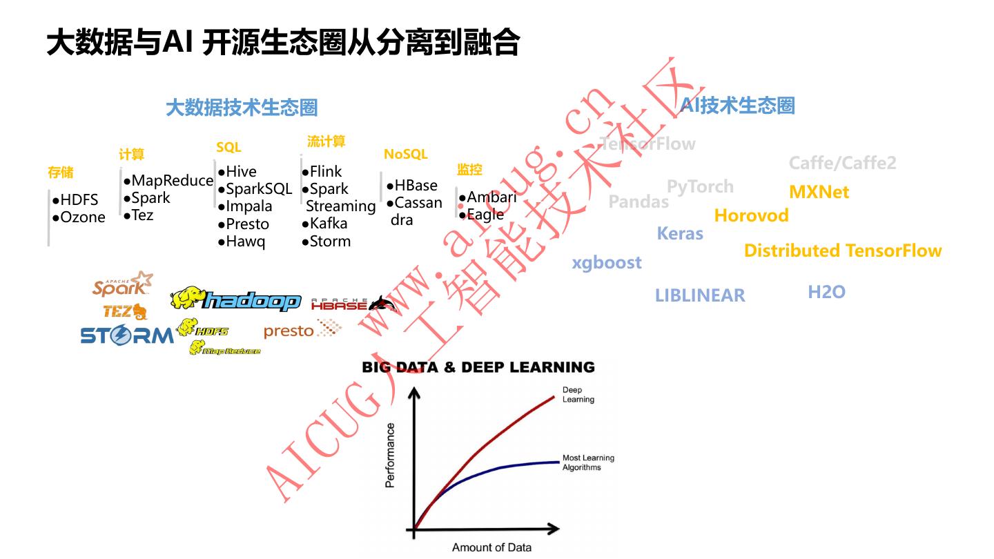 15 .大数据与AI 开源生态圈从分离到融合 区 大数据技术生态圈 AI技术生态圈 术 cn 社 SQL 流计算 TensorFlow 技 g. 计算 NoSQL 存储 ●Hive ●Flink 监控 Caffe/Caffe2 ●MapReduce ●HBase PyTorch ●SparkSQL ●Spark MXNet 能 cu ●HDFS ●Spark ●Ambari Pandas ●Impala Streaming ●Cassan ●Ozone ●Tez ●Presto ●Kafka dra ●Eagle Horovod Keras 智 ai ●Hawq ●Storm Distributed TensorFlow xgboost 工 . H2O ww LIBLINEAR G人 w CU AI