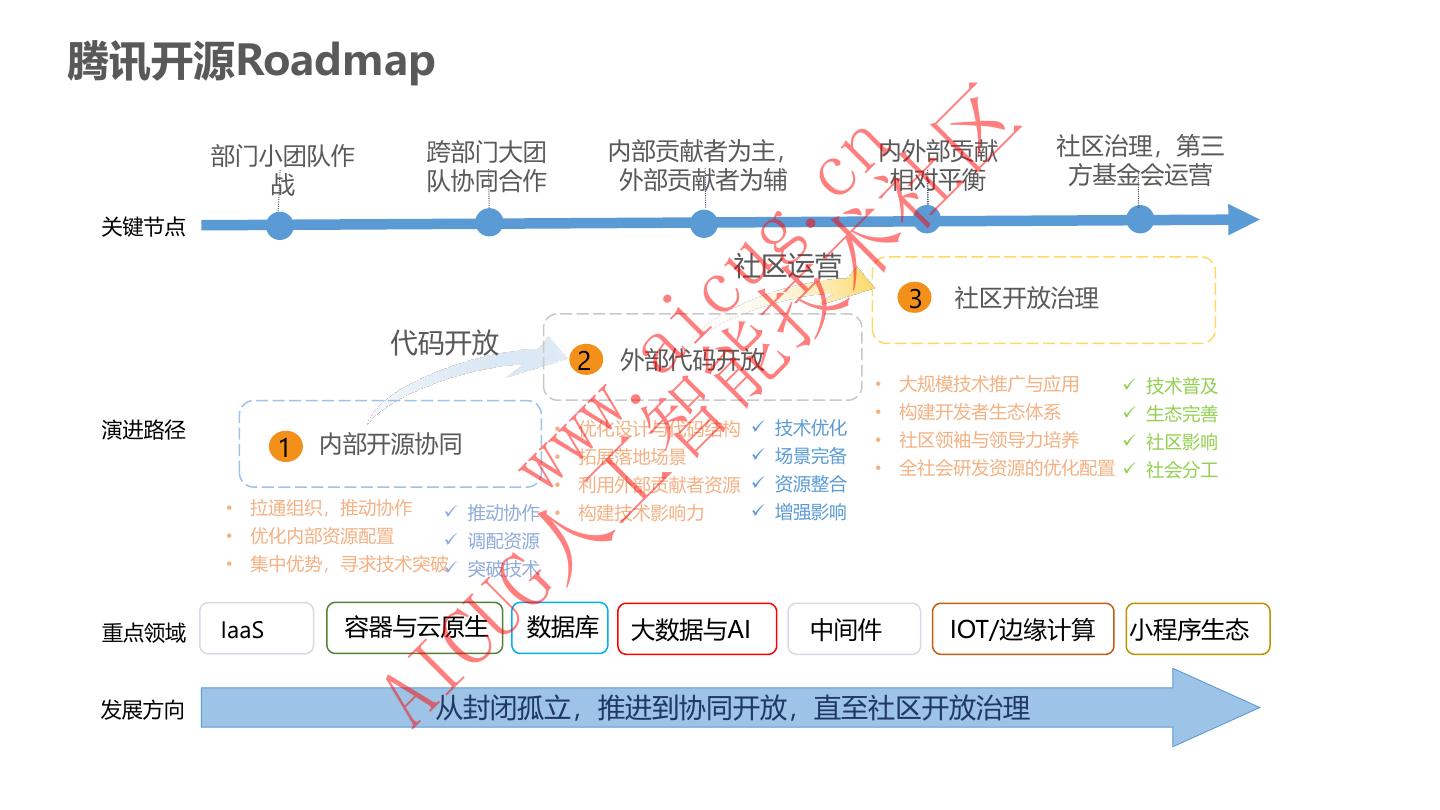 17 .腾讯开源Roadmap 区 部门小团队作 跨部门大团 内部贡献者为主, 内外部贡献 社区治理,第三 术 cn 战 队协同合作 外部贡献者为辅 相对平衡 方基金会运营 社 技 g. 关键节点 社区运营 能 cu 3 社区开放治理 智 ai 代码开放 2 外部代码开放 • 大规模技术推广与应用 ü 技术普及 工 . • 构建开发者生态体系 ü 生态完善 ww 演进路径 • 优化设计与代码结构 ü 技术优化 1 内部开源协同 • 拓展落地场景 ü 场景完备 • 社区领袖与领导力培养 ü 社区影响 • 全社会研发资源的优化配置 ü 社会分工 • 拉通组织,推动协作 • 优化内部资源配置 G人 w • 利用外部贡献者资源 ü 资源整合 ü 推动协作 • 构建技术影响力 ü 调配资源 • 集中优势,寻求技术突破ü 突破技术 ü 增强影响 IaaS 容器与云原生 数据库 大数据与AI 中间件 IOT/边缘计算 小程序生态 CU 重点领域 AI 发展方向 从封闭孤立,推进到协同开放,直至社区开放治理