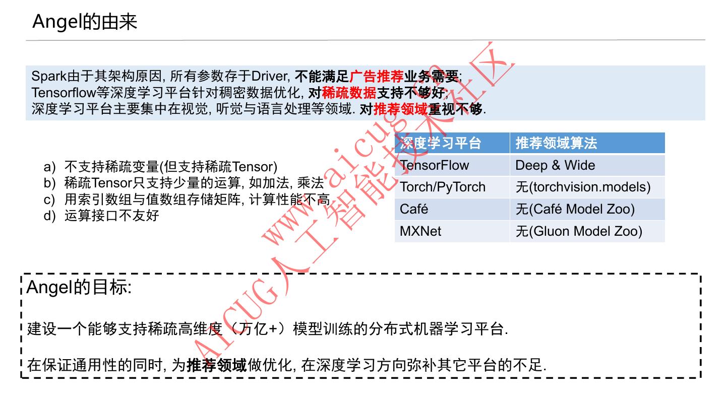 20 .Angel的由来 区 Spark由于其架构原因, 所有参数存于Driver, 不能满足广告推荐业务需要; 术 cn Tensorflow等深度学习平台针对稠密数据优化, 对稀疏数据支持不够好; 社 深度学习平台主要集中在视觉, 听觉与语言处理等领域. 对推荐领域重视不够. 技 g. 能 cu 深度学习平台 推荐领域算法 a) 不支持稀疏变量(但支持稀疏Tensor) TensorFlow Deep & Wide 智 ai b) 稀疏Tensor只支持少量的运算, 如加法, 乘法 Torch/PyTorch 无(torchvision.models) c) 工 . 用索引数组与值数组存储矩阵, 计算性能不高 d) Café 无(Café Model Zoo) ww 运算接口不友好 MXNet 无(Gluon Model Zoo) G人 w Angel的目标: CU 建设一个能够支持稀疏高维度(万亿+)模型训练的分布式机器学习平台. AI 在保证通用性的同时, 为推荐领域做优化, 在深度学习方向弥补其它平台的不足.