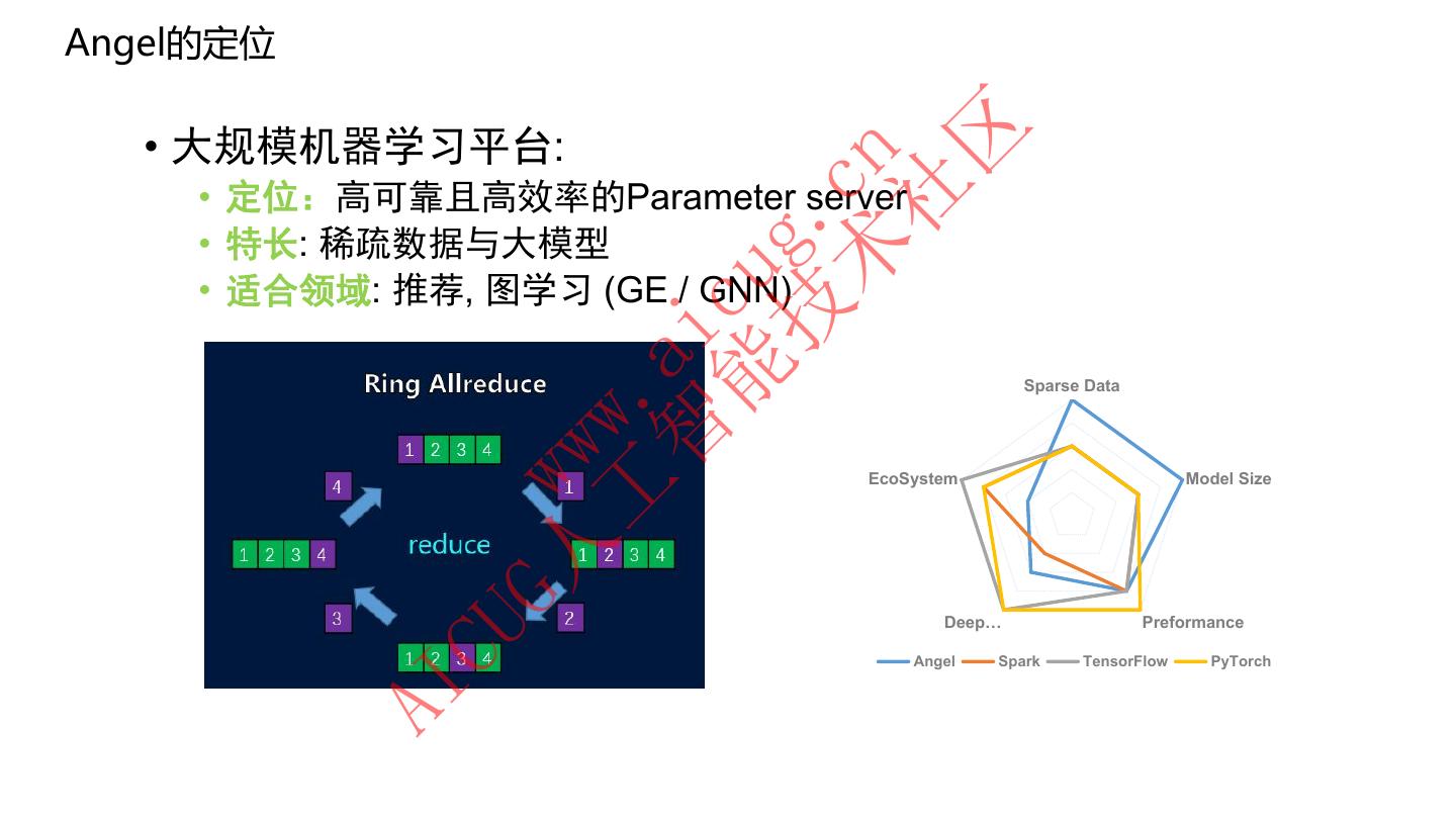 21 .Angel的定位 • 大规模机器学习平台: 区 术 cn • 定位:高可靠且高效率的Parameter server 社 技 g. • 特长: 稀疏数据与大模型 • 适合领域: 推荐, 图学习 (GE / GNN) 能 cu 智 ai Sparse Data 工 . ww EcoSystem Model Size G人 w Deep… Preformance CU Angel Spark TensorFlow PyTorch AI