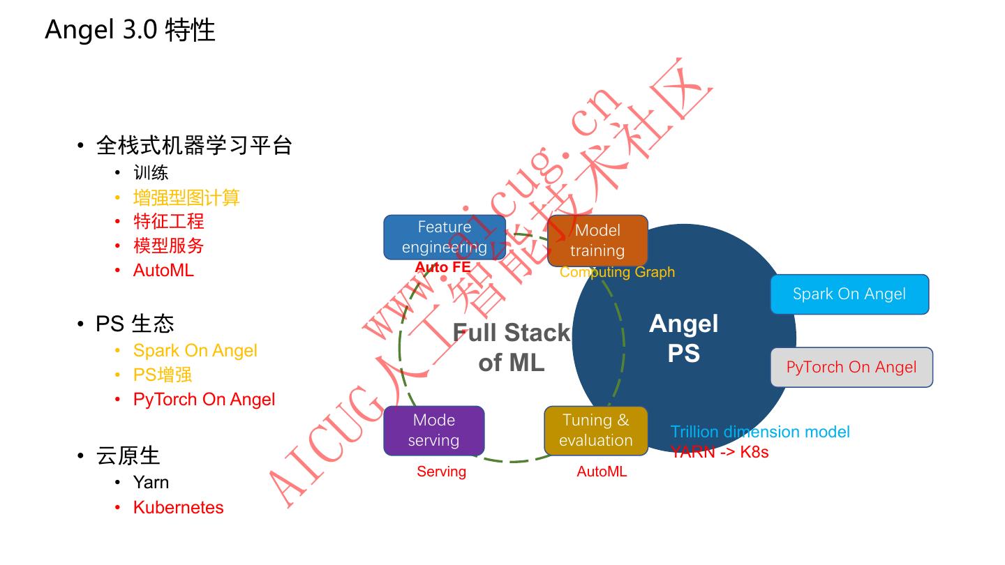 22 .Angel 3.0 特性 区 术 cn 社 • 全栈式机器学习平台 技 g. • 训练 能 cu • 增强型图计算 • 特征工程 Feature Model 智 ai • 模型服务 engineering training • AutoML Auto FE Computing Graph 工 . Spark On Angel ww • PS 生态 Full Stack Angel • Spark On Angel • PS增强 G人 w of ML PS PyTorch On Angel • PyTorch On Angel Mode Tuning & Trillion dimension model CU serving evaluation • 云原生 YARN -> K8s Serving AutoML PS Ecosystem AI • Yarn • Kubernetes