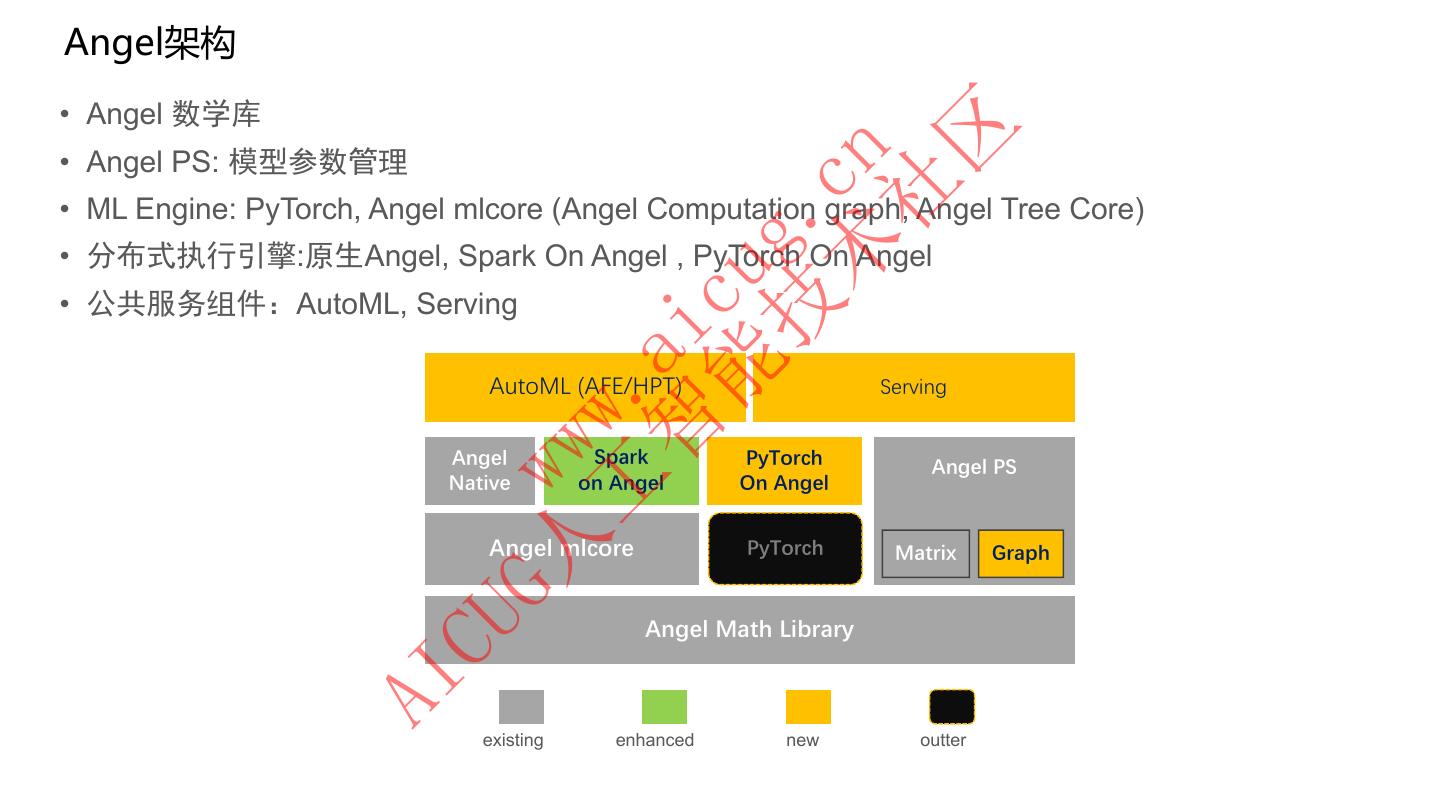 23 .Angel架构 • Angel 数学库 区 • Angel PS: 模型参数管理 术 cn 社 • ML Engine: PyTorch, Angel mlcore (Angel Computation graph, Angel Tree Core) 技 g. • 分布式执行引擎:原生Angel, Spark On Angel , PyTorch On Angel 能 cu • 公共服务组件:AutoML, Serving 智 ai AutoML (AFE/HPT) Serving 工 . ww Angel Spark PyTorch Angel PS G人 w Native on Angel Angel mlcore On Angel PyTorch Matrix Graph Angel Math Library CU AI existing enhanced new outter