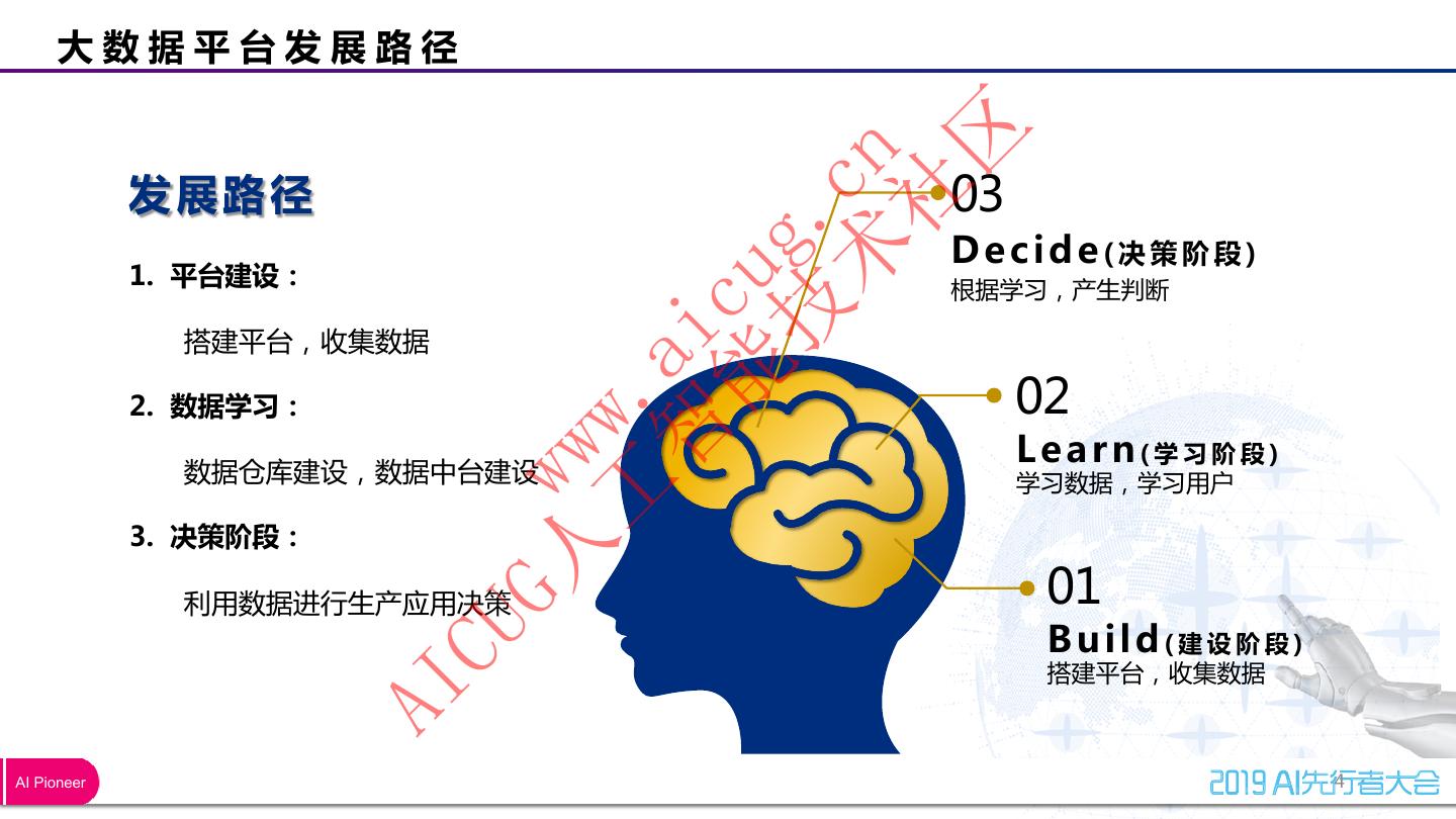 5 . 大数据平台发展路径 区 术 cn 发展路径 03 社 技 g. Decide(决策阶段) 1. 平台建设: 能 cu 根据学习,产生判断 搭建平台,收集数据 智 ai 02 工 . 2. 数据学习: ww Learn(学习阶段) 数据仓库建设,数据中台建设 学习数据,学习用户 3. 决策阶段: G人 w 利用数据进行生产应用决策 01 Build(建设阶段) CU 搭建平台,收集数据 AI AI Pioneer 4