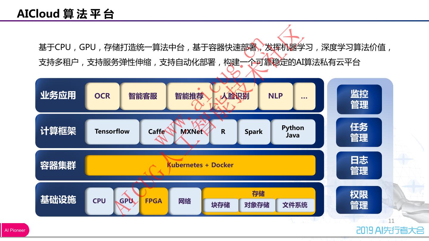 12 . AICloud 算 法 平 台 区 基于CPU,GPU,存储打造统一算法中台,基于容器快速部署,发挥机器学习,深度学习算法价值, 术 cn 社 支持多租户,支持服务弹性伸缩,支持自动化部署,构建一个可靠稳定的AI算法私有云平台 技 g. 能 cu 业务应用 OCR 智能客服 智能推荐 人脸识别 NLP … 监控 智 ai 管理 工 . 任务 ww Python 计算框架 Tensorflow Caffe MXNet R Spark Java 管理 容器集群 G人 w Kubernetes + Docker 日志 管理 CU 存储 权限 基础设施 CPU GPU FPGA 网络 管理 AI 块存储 对象存储 文件系统 11 AI Pioneer