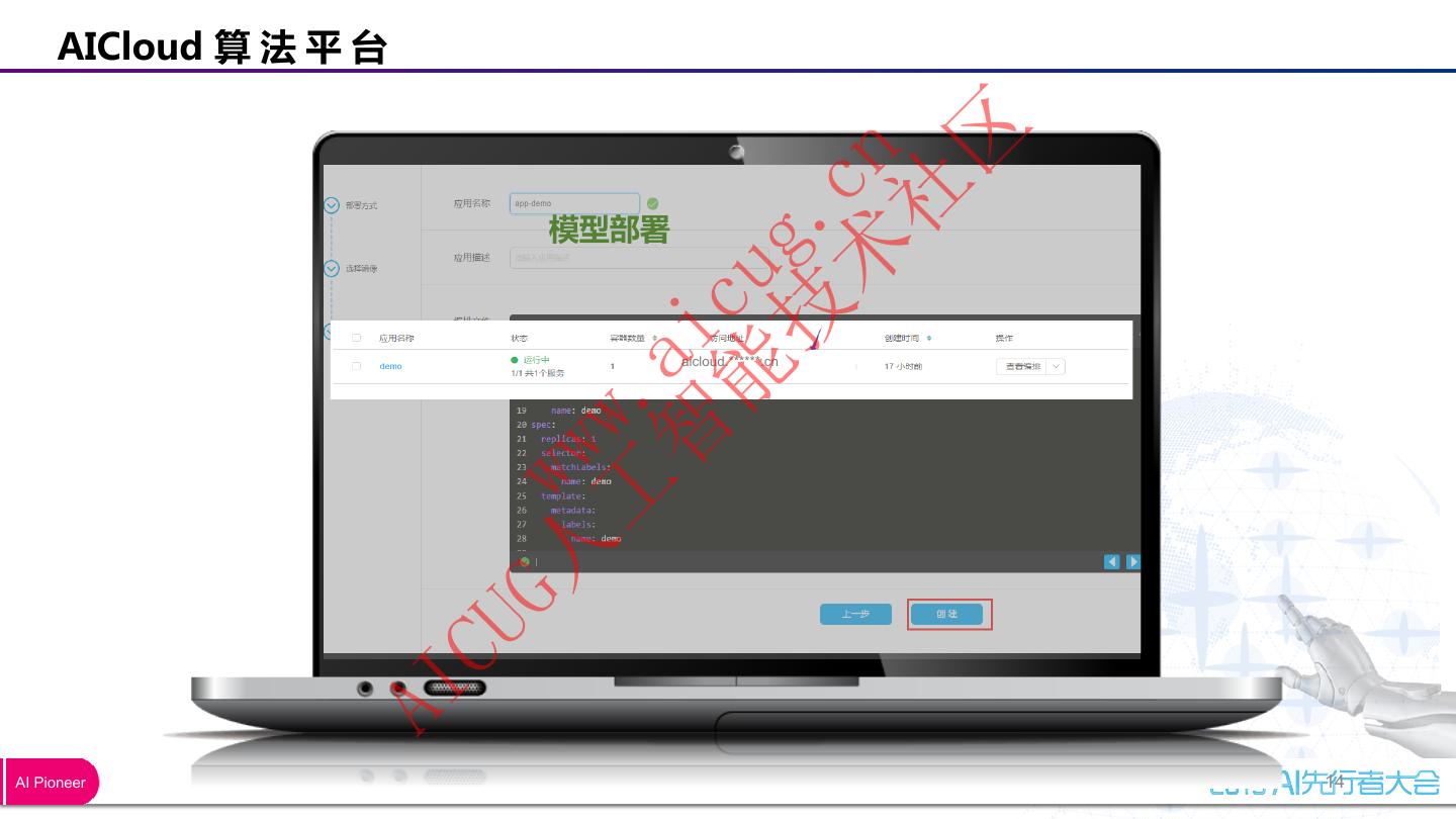 15 . AICloud 算 法 平 台 区 术 cn 等待训练结果 社 申请资源 技 g. 模型部署 上传算法 能 cu 智 ai aicloud.******.cn 工 . ww G人 w CU AI AI Pioneer 14