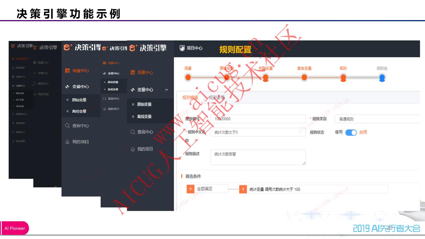 21 . 决策引擎功能示例 区 场景配置 计算逻辑配置 规则配置 术 cn 系统资源配置 社 接入数据源配置 技 g. 能 cu 智 ai 工 . ww G人 w CU AI AI Pioneer 20