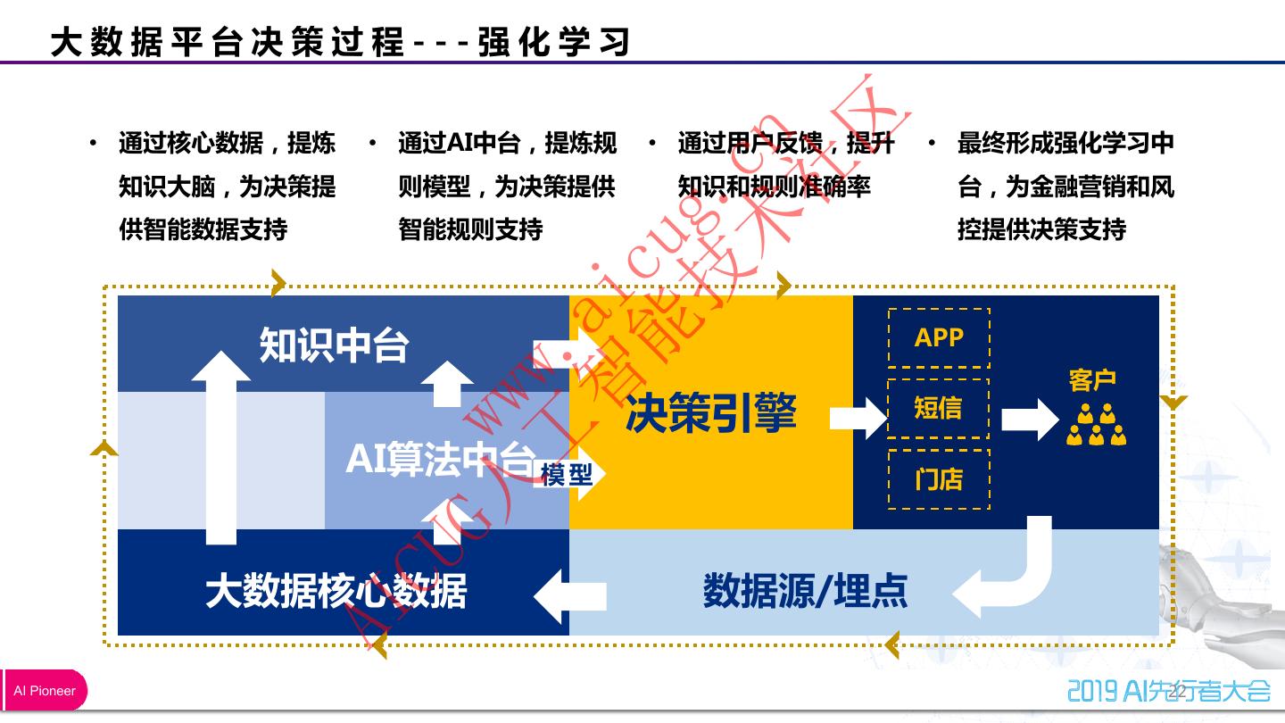 23 . 大数据平台决策过程---强化学习 区 • 通过核心数据,提炼 • 通过AI中台,提炼规 • 通过用户反馈,提升 • 最终形成强化学习中 术 cn 社 知识大脑,为决策提 则模型,为决策提供 知识和规则准确率 台,为金融营销和风 技 g. 供智能数据支持 智能规则支持 控提供决策支持 能 cu 智 ai 知识中台 APP 工 . 客户 ww 决策引擎 短信 G人 w AI算法中台 模 型 门店 CU 大数据核心数据 数据源/埋点 AI AI Pioneer 22