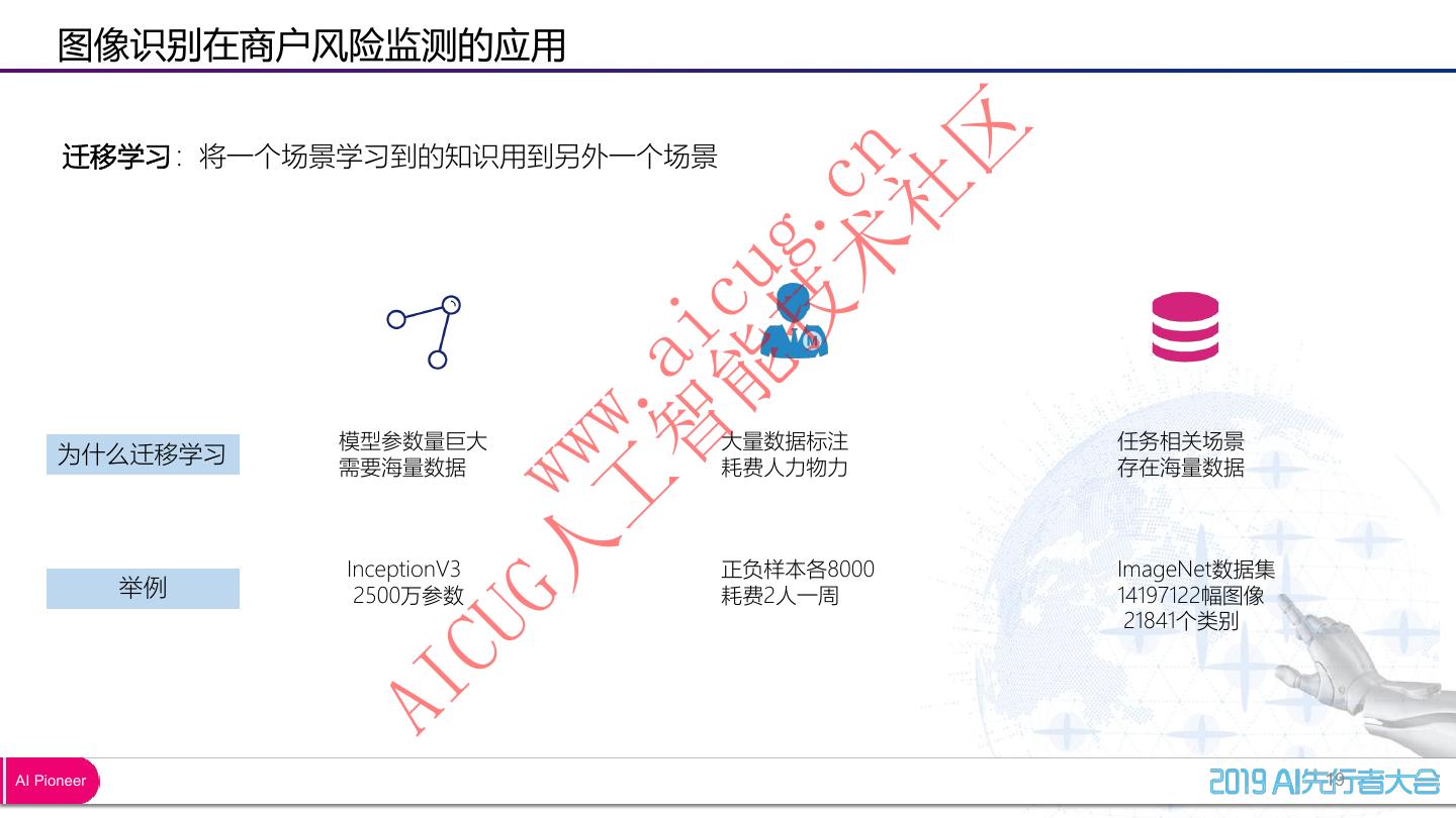 20 . 图像识别在商户风险监测的应用 区 迁移学习:将一个场景学习到的知识用到另外一个场景 术 cn 社 技 g. 能 cu 智 ai 工 . ww 模型参数量巨大 大量数据标注 任务相关场景 为什么迁移学习 需要海量数据 耗费人力物力 存在海量数据 G人 w InceptionV3 正负样本各8000 ImageNet数据集 举例 2500万参数 耗费2人一周 14197122幅图像 21841个类别 CU AI AI Pioneer 19