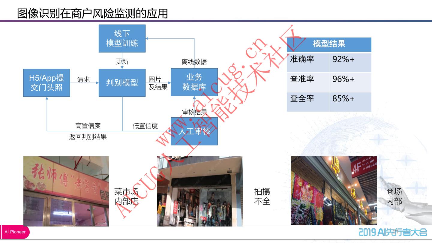 18 . 图像识别在商户风险监测的应用 区 术 cn 社 人工审核的挑战: 技 g. • 日进件量成千上万, 能 cu 需要大量人力审核 智 ai 符合要求的门头照 符合要求的室内照 • 依赖每个审核人员 的主观判断 工 . 人工审核 ww • 人工分工审核,不 利于发现重复照片 G人 w 不符合要求 不符合要求 CU 拍摄不全 非门头照 AI AI Pioneer 17
