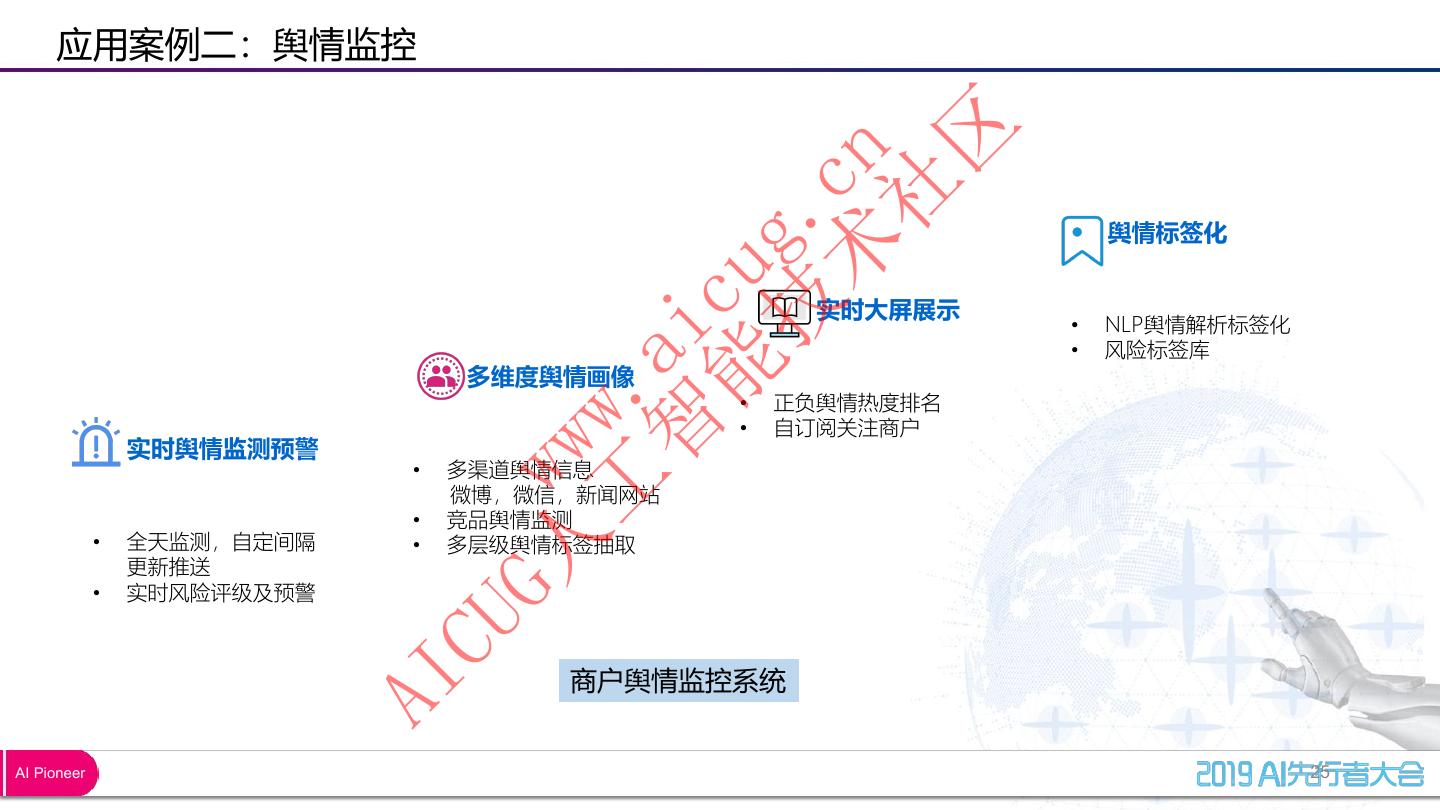 26 . 应用案例二:舆情监控 区 术 cn 社 技 g. 舆情标签化 能 cu 实时大屏展示 • NLP舆情解析标签化 智 ai • 风险标签库 多维度舆情画像 工 . • 正负舆情热度排名 ww • 自订阅关注商户 实时舆情监测预警 • 多渠道舆情信息 • 全天监测,自定间隔 • • G人 w 微博,微信,新闻网站 竞品舆情监测 多层级舆情标签抽取 更新推送 • 实时风险评级及预警 CU 商户舆情监控系统 AI AI Pioneer 25