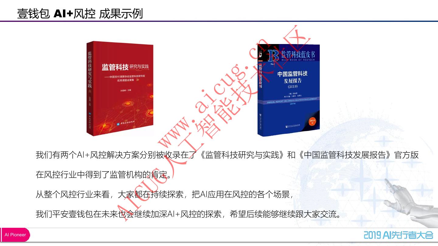 27 . 壹钱包 AI+风控 成果示例 区 术 cn 社 技 g. 能 cu 智 ai 工 . ww G人 w 我们有两个AI+风控解决方案分别被收录在了《监管科技研究与实践》和《中国监管科技发展报告》官方版 在风控行业中得到了监管机构的肯定。 CU 从整个风控行业来看,大家都在持续探索,把AI应用在风控的各个场景, AI 我们平安壹钱包在未来也会继续加深AI+风控的探索,希望后续能够继续跟大家交流。 AI Pioneer