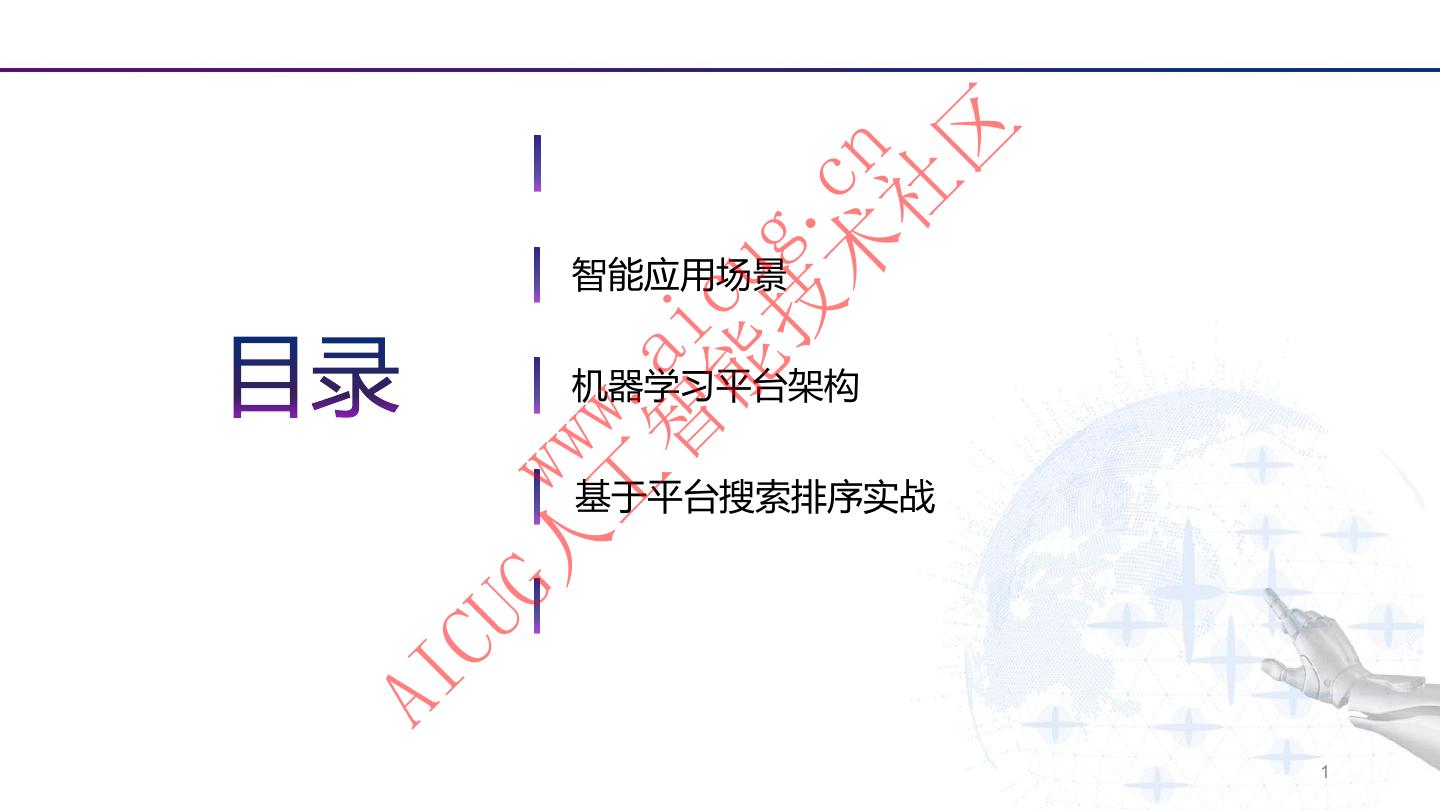 2 . AI CU G人 w ww 工 . 智 ai 能 cu 智能应用场景 技 g. 机器学习平台架构 术 cn 社 基于平台搜索排序实战 区 1